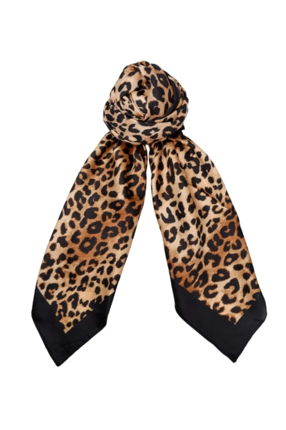 Satin tørklæde fra Black Colour med leopardmønster i beige og brune nuancer. Tørklædet har en sort kant og er fremstillet af blødt satinmateriale med et blankt udtryk.