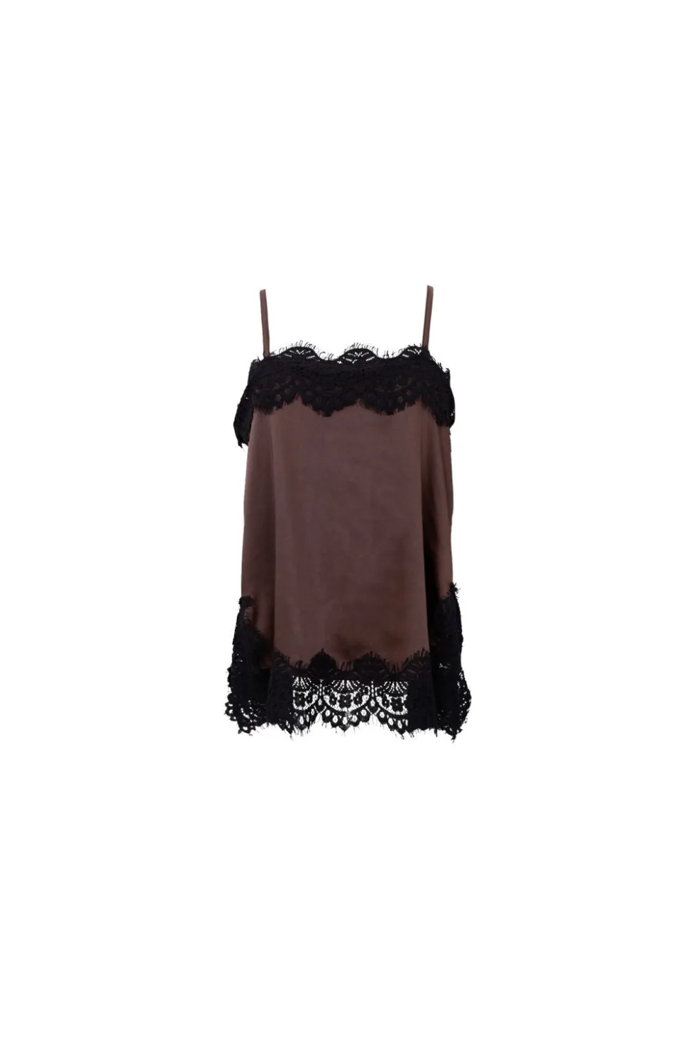 Brun top fra Black Colour med sorte blonder langs halsudskæringen og bunden. Toppen har en løs pasform og en firkantet halsudskæring med tynde spaghetti-stropper.