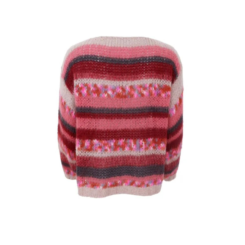 Stribet jumper fra Black Colour med striber i pink, dyb rød og grå. Jumperen har et flerstribet mønster med blomsterlignende detaljer.
