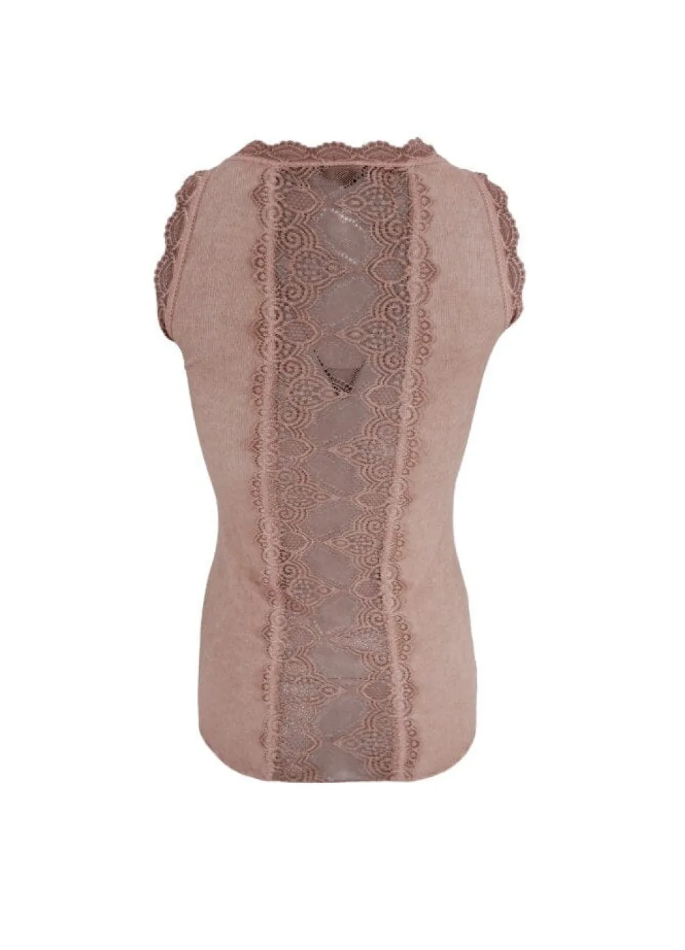 Ribstrikket top fra Black Colour i rosa. Toppen har blondedetaljer ved halsudskæringen og en blondeindsats på ryggen. Den ribbede struktur giver en god pasform.