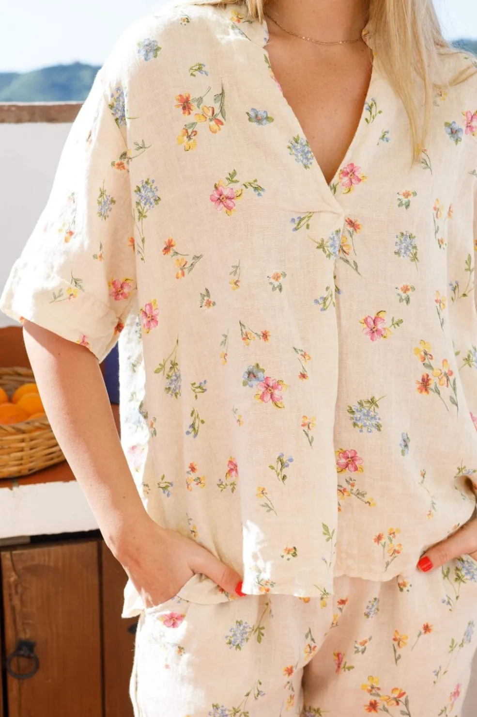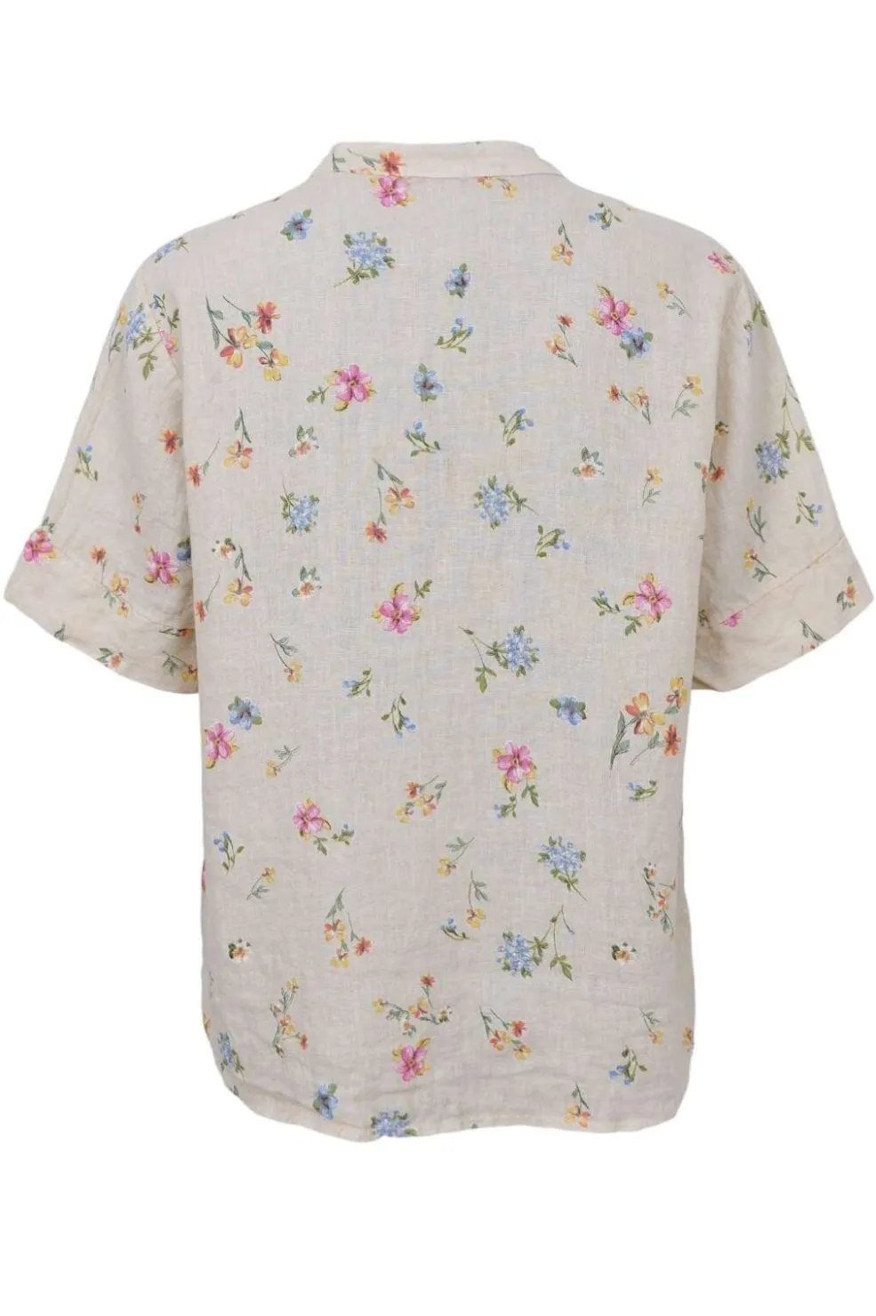 Hørbluse fra Black Colour med korte ærmer og V-halsudskæring. Blusen har et blomstermønster i creme- og hvide nuancer på en lys bund.