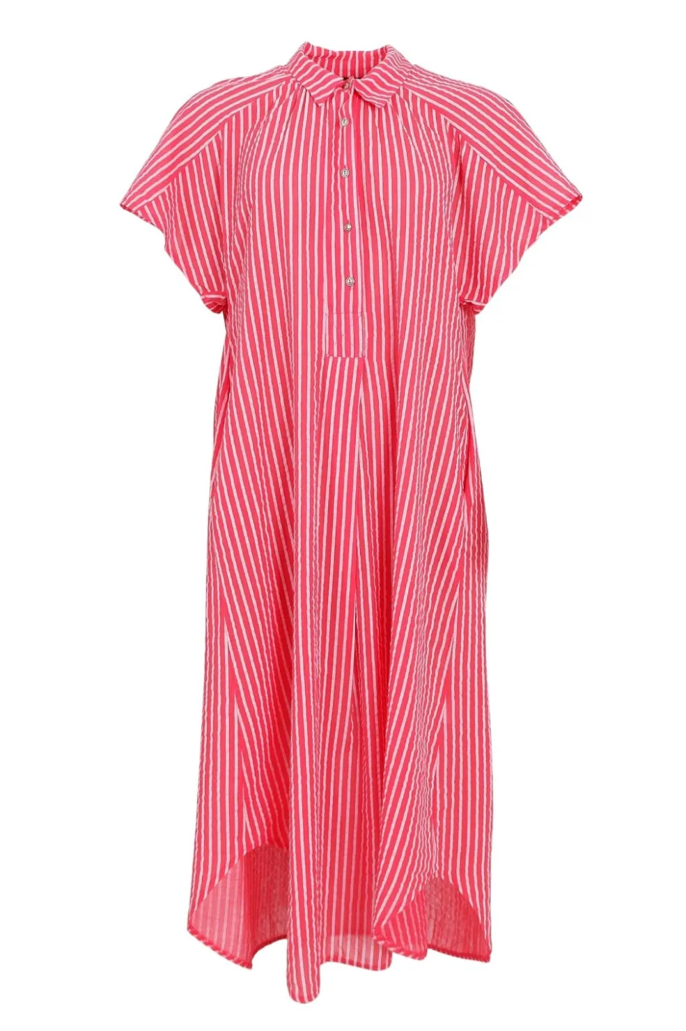 Lang kjole fra Black Colour med røde og hvide striber. Den har skjortekrave, korte ærmer og en knaplukning foran.