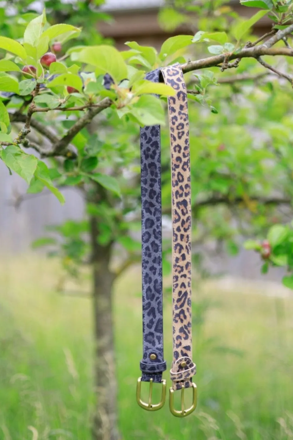 Ruskindsbælte fra Black Colour med leopardprint i grå nuancer. Bæltet har et gyldent spænde og passer til både kontortøj og festlige outfits.
