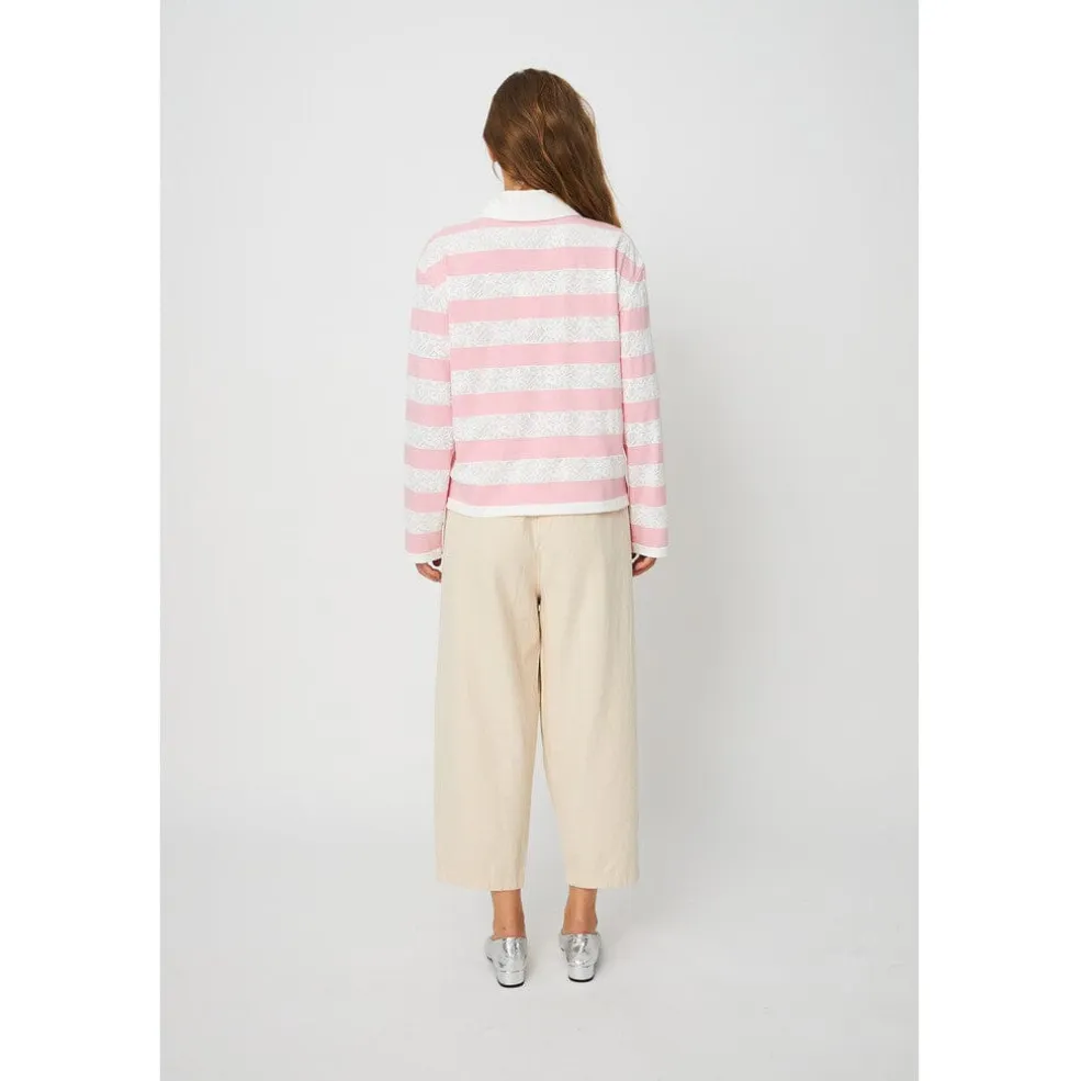 Stribet bluse fra Cras med horisontale striber i rosa og cremehvid. Blusen har polokrave, knaplukning foran og en løs pasform, der giver god bevægelsesfrihed.