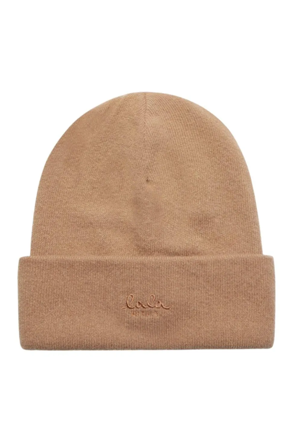 Beanie fra Lala Berlin, lavet af en cashmere-blanding i brune og beige nuancer. Huen har et broderet logo på fronten.