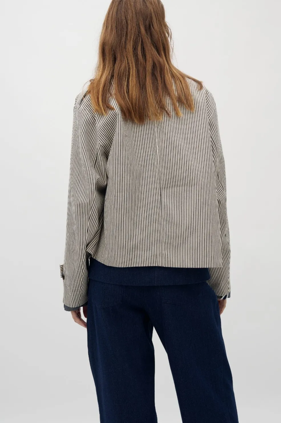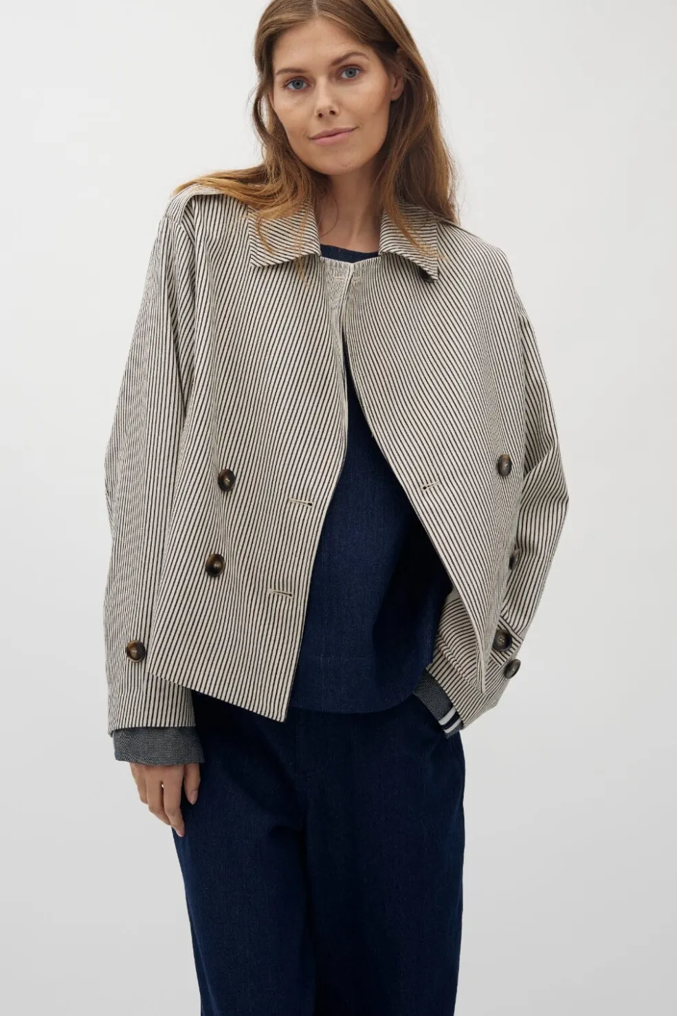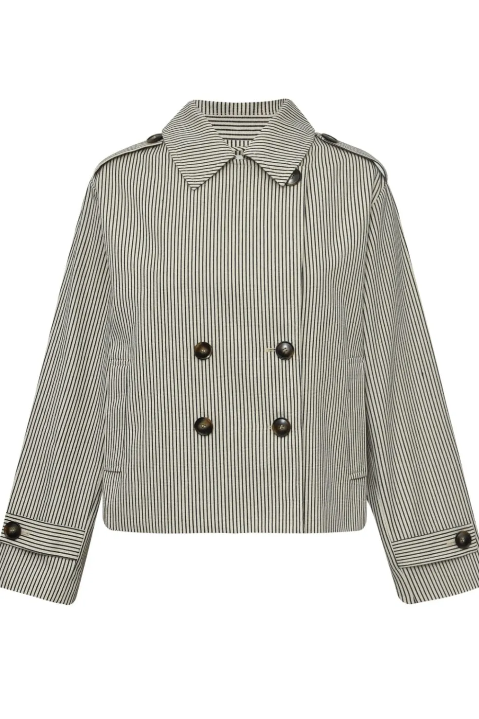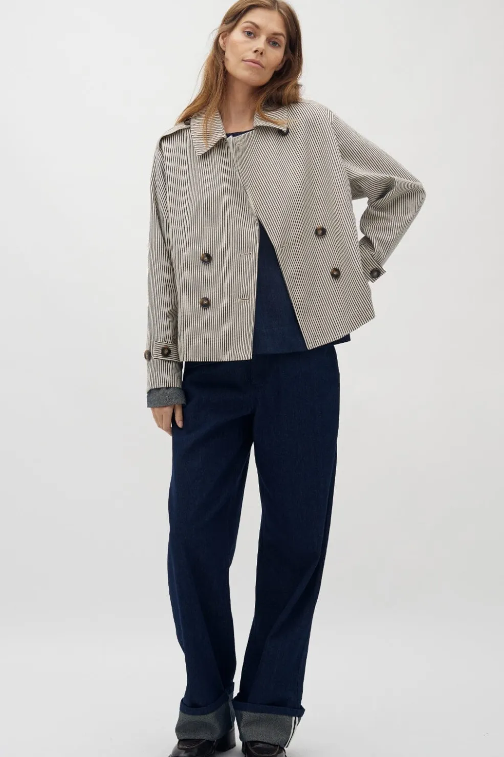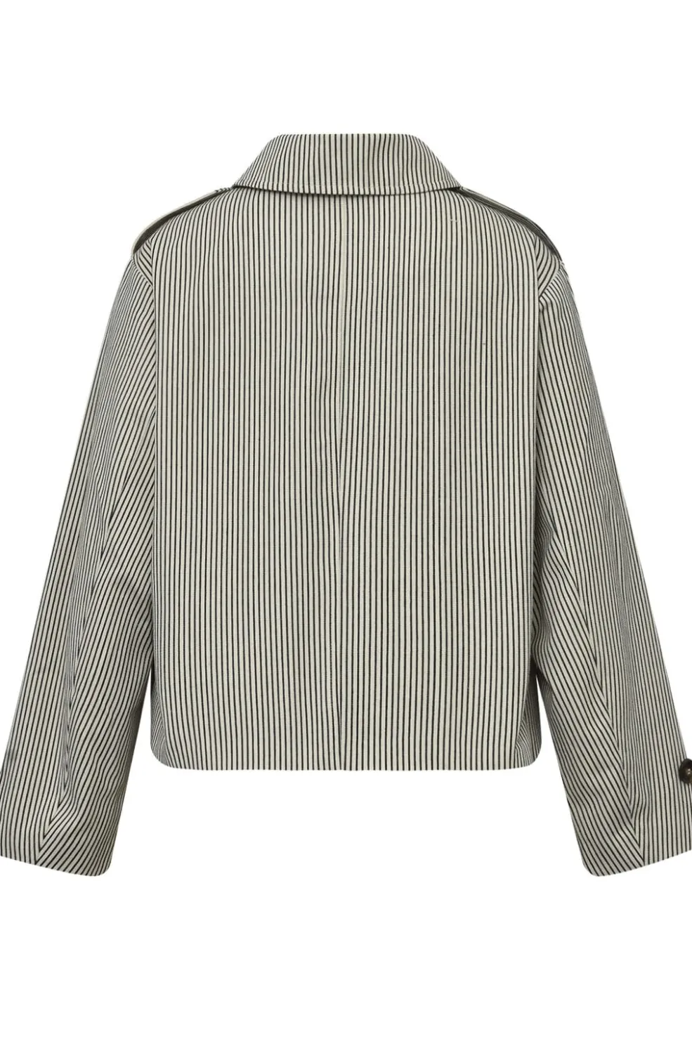 Kort jakke fra Global Funk i sort og beige striber. Den dobbeltradede front har store knapper, og jakken kommer med en skjortekrave og lange ærmer.