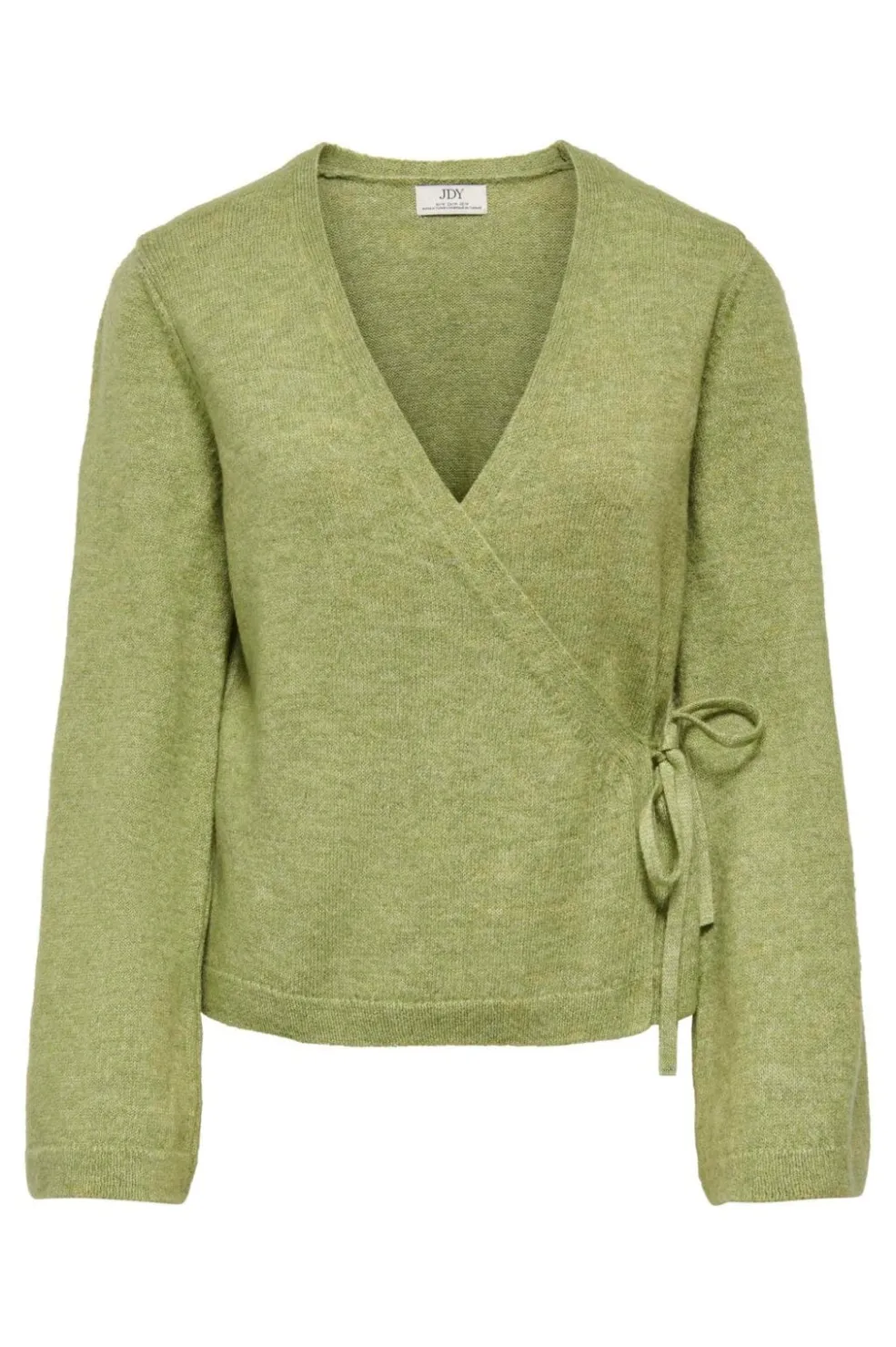 Slå-om-cardigan fra JDY i en grøn meleret nuance. Cardiganen har en V-hals, lange ærmer og en bindebåndslukning i siden.