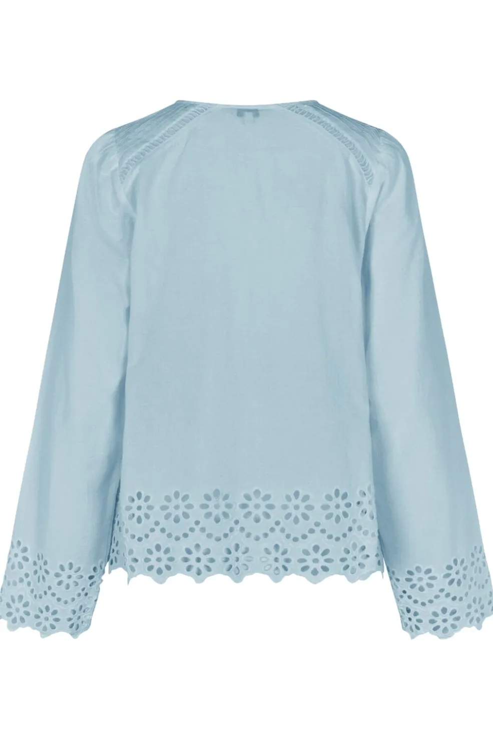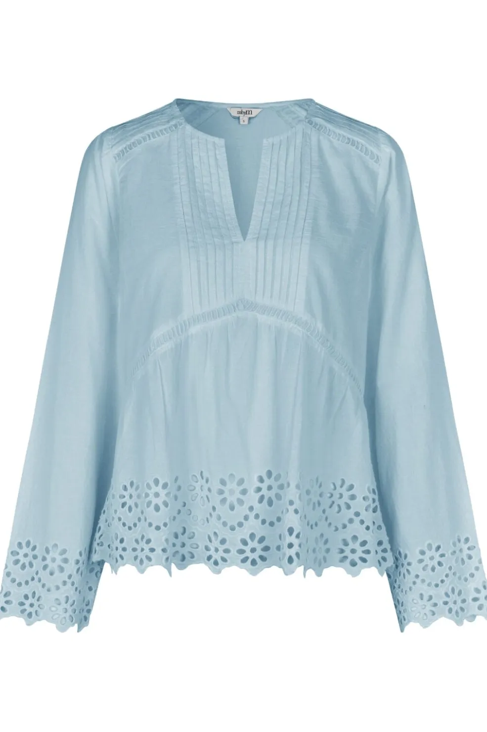 Lyseblå bluse fra MbyM i bomuld med v-udskæring og lange ærmer. Blusen har blomsterbroderi langs kanten og dekorative folder ved udskæringen.