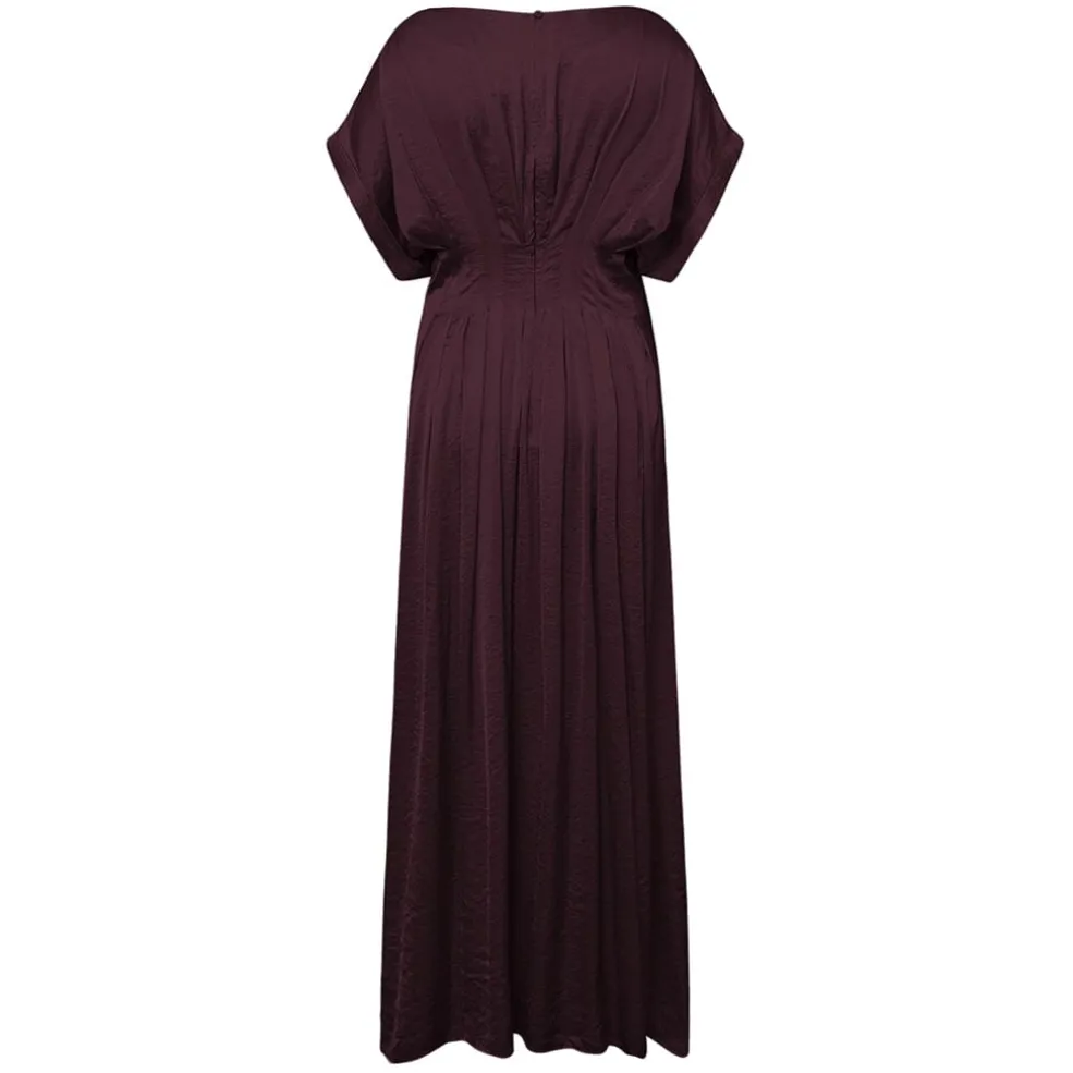 Lang kjole fra Gossia i mørk lilla. Kjolen har en løs pasform med V-hals og korte ærmer i batwing-stil. Den markerede talje og flæsedetaljer giver kjolen et feminint udtryk.