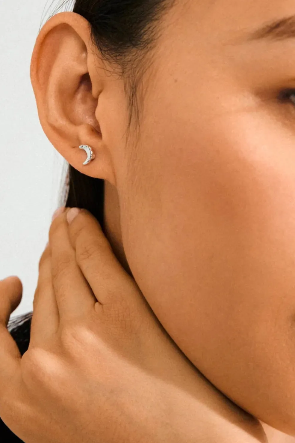 Sølvbelagte halvmåneørestikker fra Pilgrim med et enkelt design. Ørestikkerne er lavet af genbrugsmaterialer og har en klar, buet form.