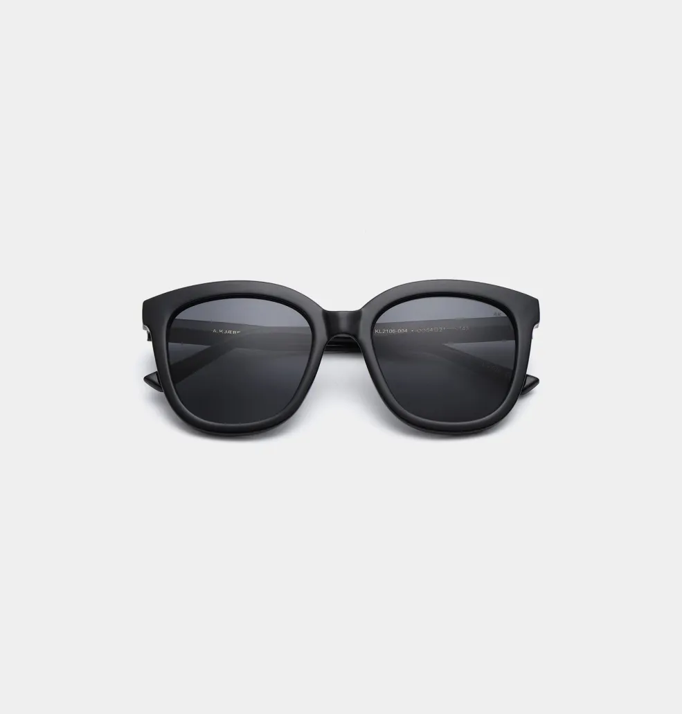 Sorte solbriller fra A. Kjærbede med store firkantede linser og mat ramme. Brillerne har UV 400-beskyttelse og formbare stænger med metalkerner for god pasform.