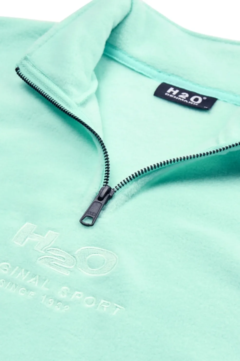 Pastelgrøn fleecetrøje med høj hals og halv lynlås. Fremstillet af blødt fleecemateriale med broderede detaljer og lange ærmer til både aktiv brug og afslapning.