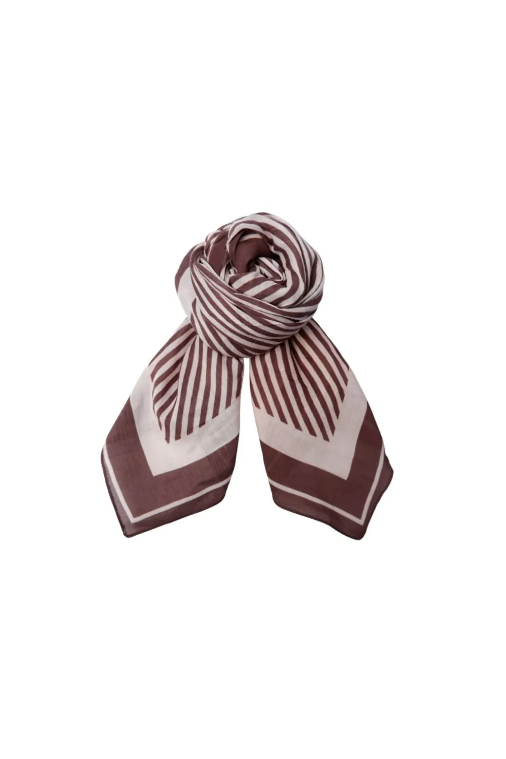 Mini tørklæde fra Black Colour i kaffe-farvet nuance med stribede mønster. Tørklædet kombinerer creme, hvide og brune striber med en tydelig kant.