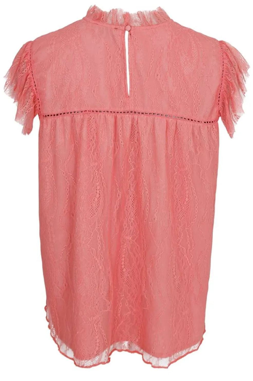 Blondetop fra Black Colour i en koralfarve med høj hals. Toppen har korte ærmer med flæser og et gennemgående blondemønster, der giver struktur til designet.