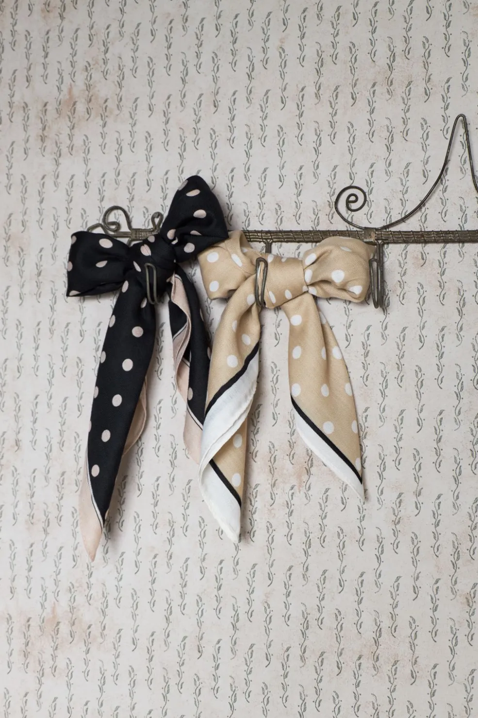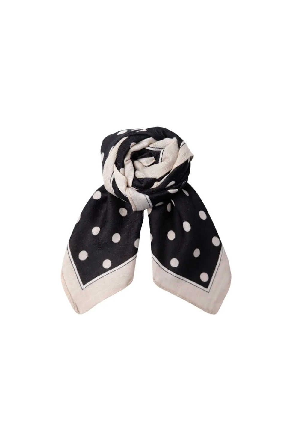 Et sort mini tørklæde fra Black Colour med hvide polkaprikker og en lys kant. Tørklædet er lavet af polyester.
