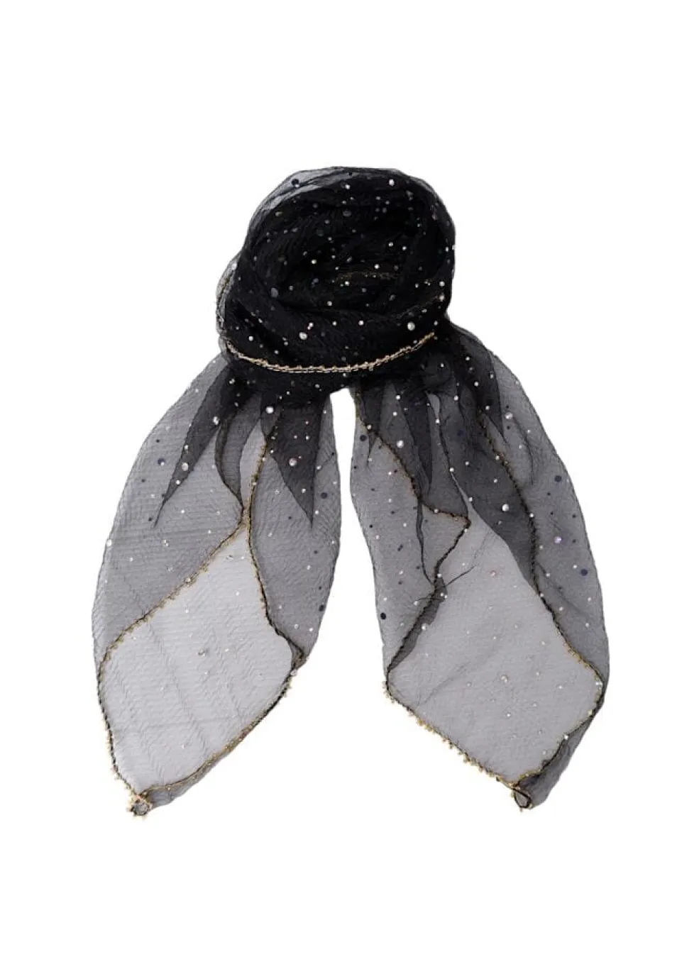 Mini-tørklæde fra Black Colour i sort med små sten spredt over stoffet og en dekorativ kant med gylden tråd.