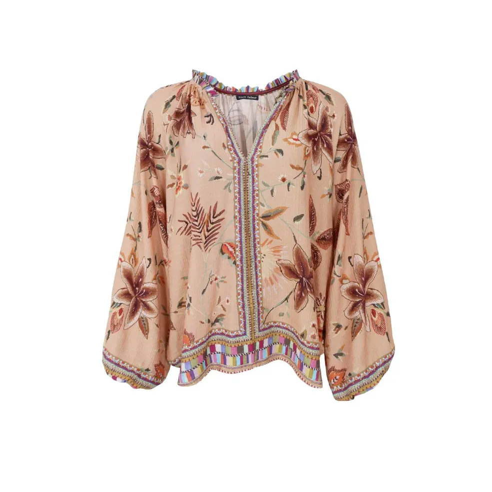 Bluse fra Black Colour i en lys beige nuance med et blomstret mønster i forskellige farver og stribede detaljer ved manchetterne og kanten.