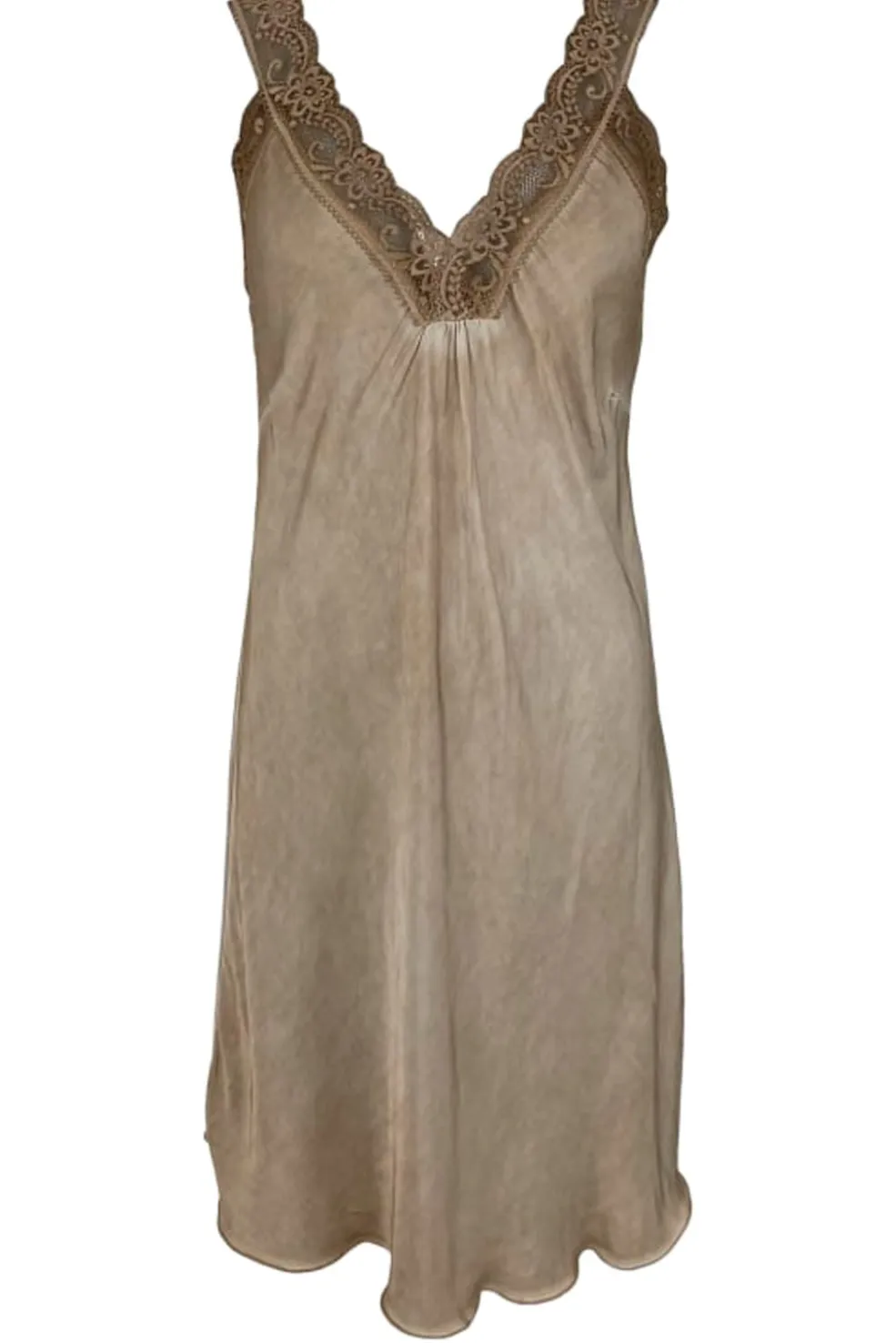 Ærmeløs kjole fra Black Colour i champagnefarvet stof med blondekant ved V-udskæringen. Kjolen har knælængde og falder let omkring kroppen.
