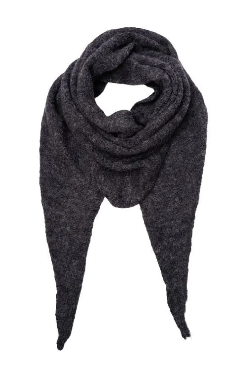 Strikket tørklæde fra Black Colour i mørkegrå melange. Dette tørklæde har et lagdelt strikket design med spidse ender og en blød fornemmelse mod huden.