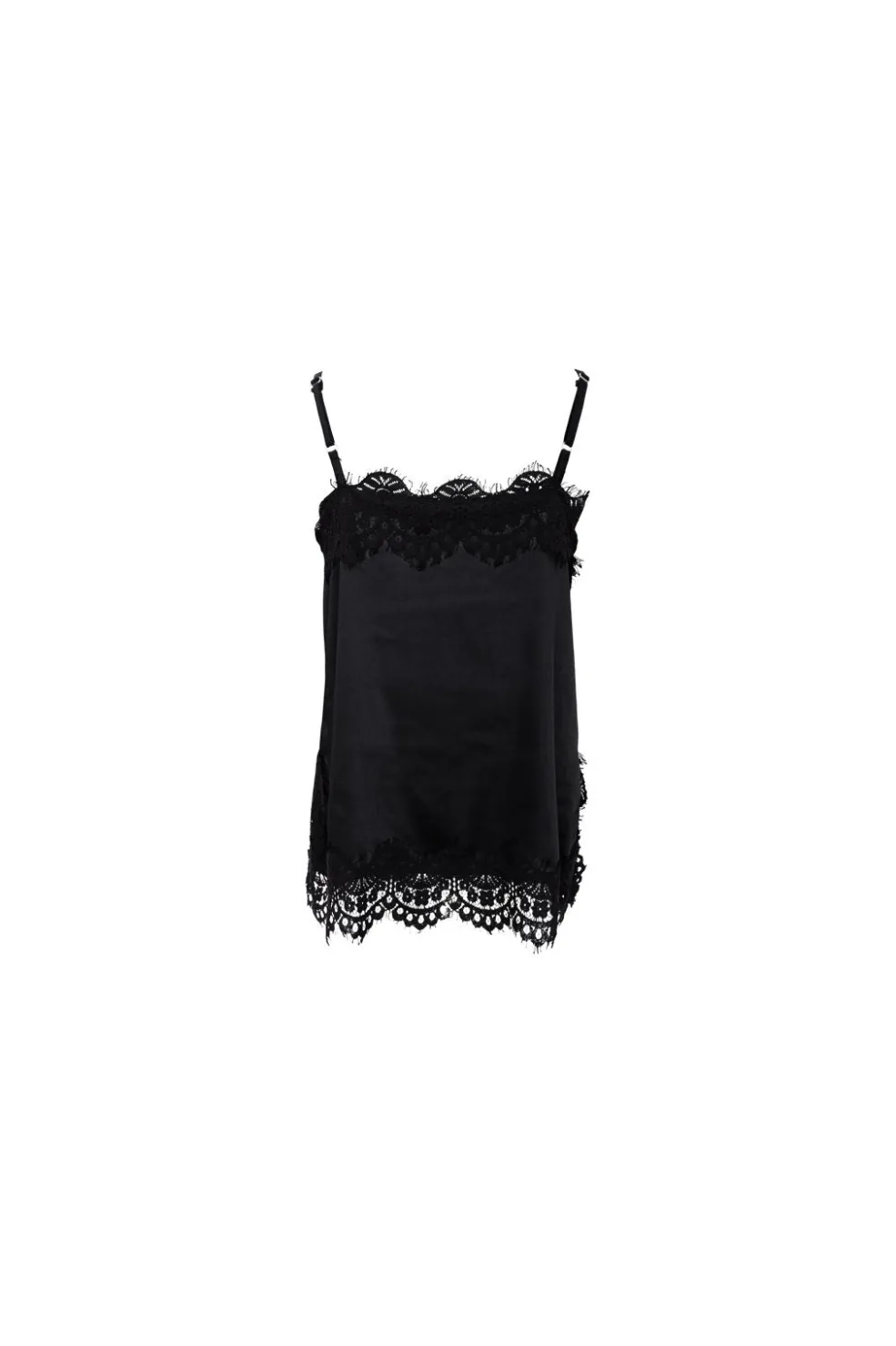 Sort top fra Black Colour med blondekanter og firkantet halsudskæring. Toppen har tynde, justerbare stropper og en løs pasform, der giver god bevægelsesfrihed.