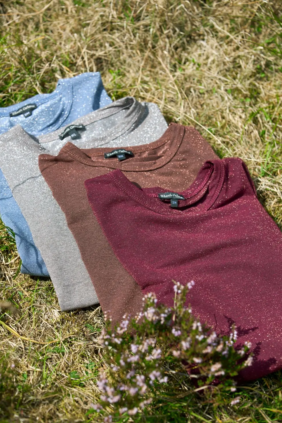 Bluse fra Black Colour i blommefarvet stof med en diskret glimmereffekt. Den har en rund halsudskæring og lange ærmer med en tætsiddende pasform.