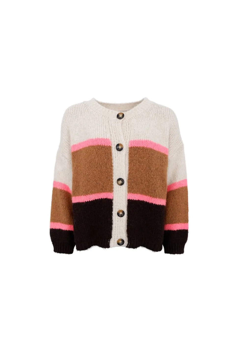 Strikket cardigan fra Black Colour i camel-nuancer med farveblokdesign. Cardiganen har brune, beige, lyserøde, creme og hvide striber i et stribet mønster.