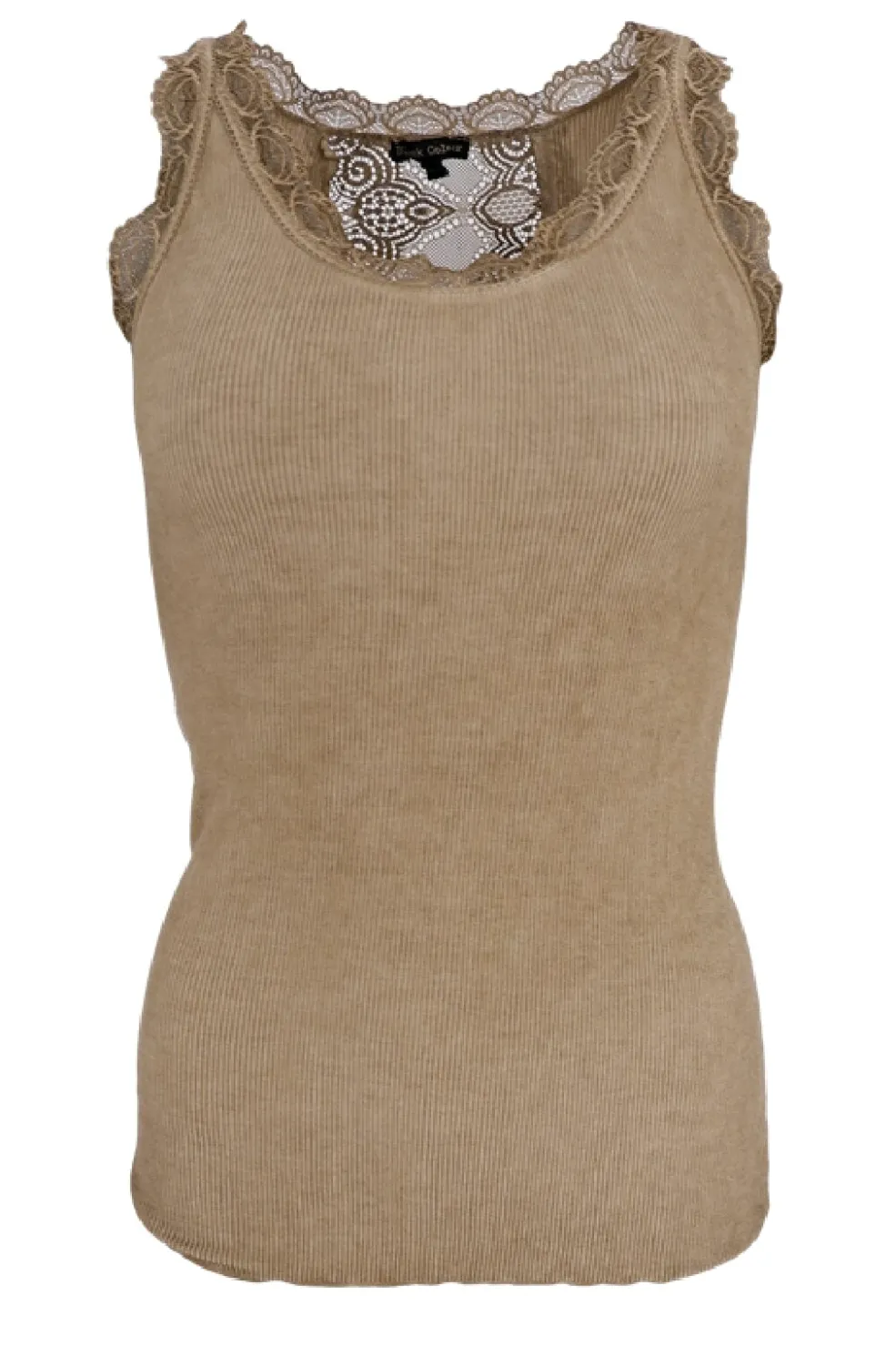 Ribbet top fra Black Colour i champagnefarvet viscose med blondekanter ved ærmegab og hals. Et blondepanel på ryggen giver toppen et feminint præg.