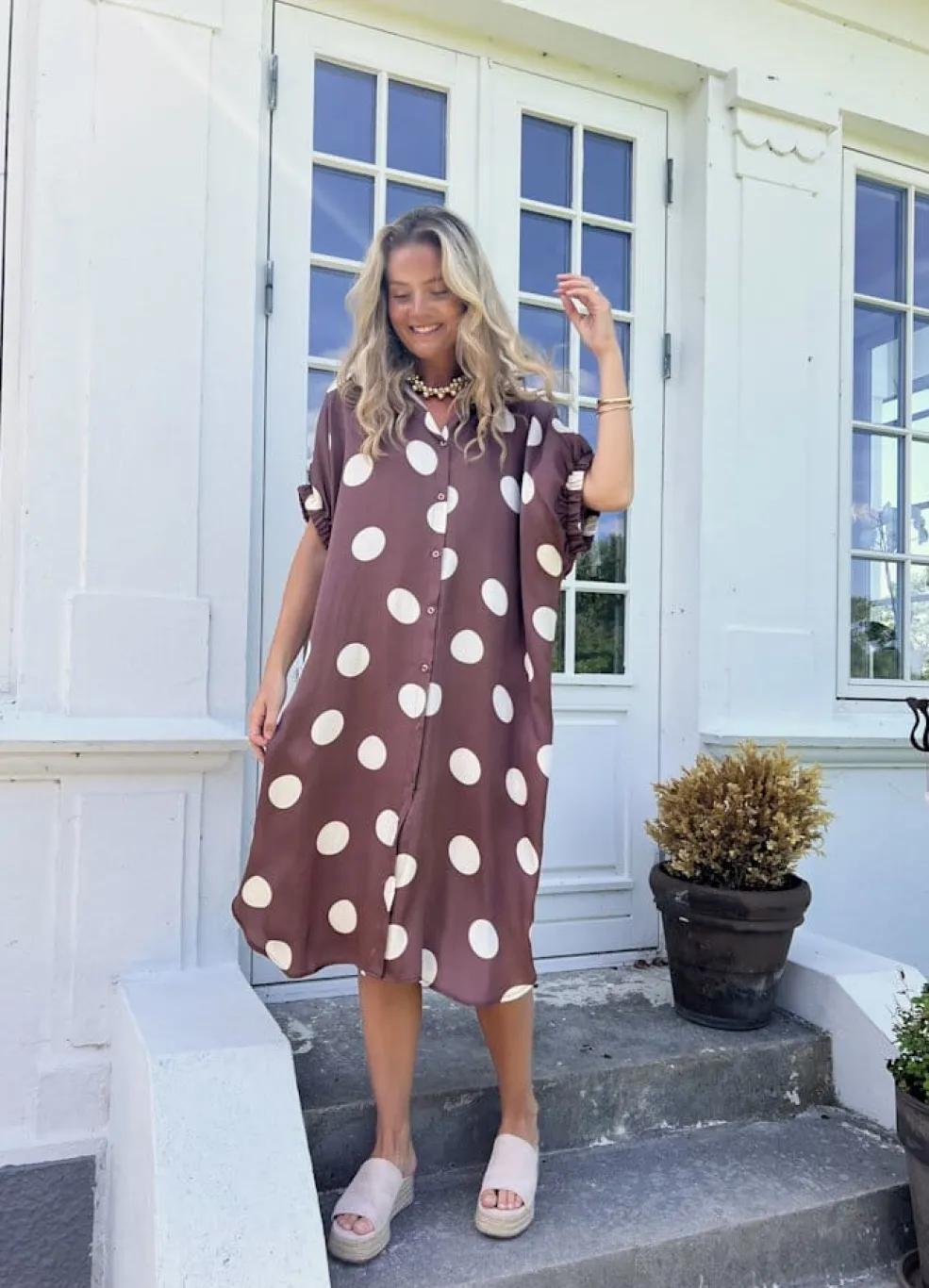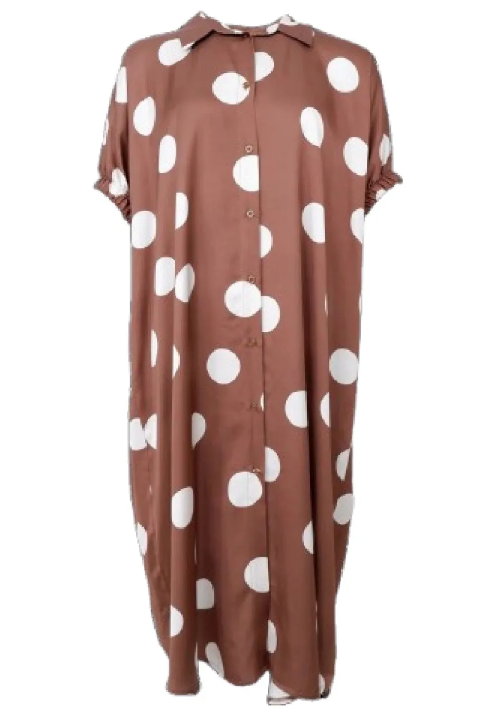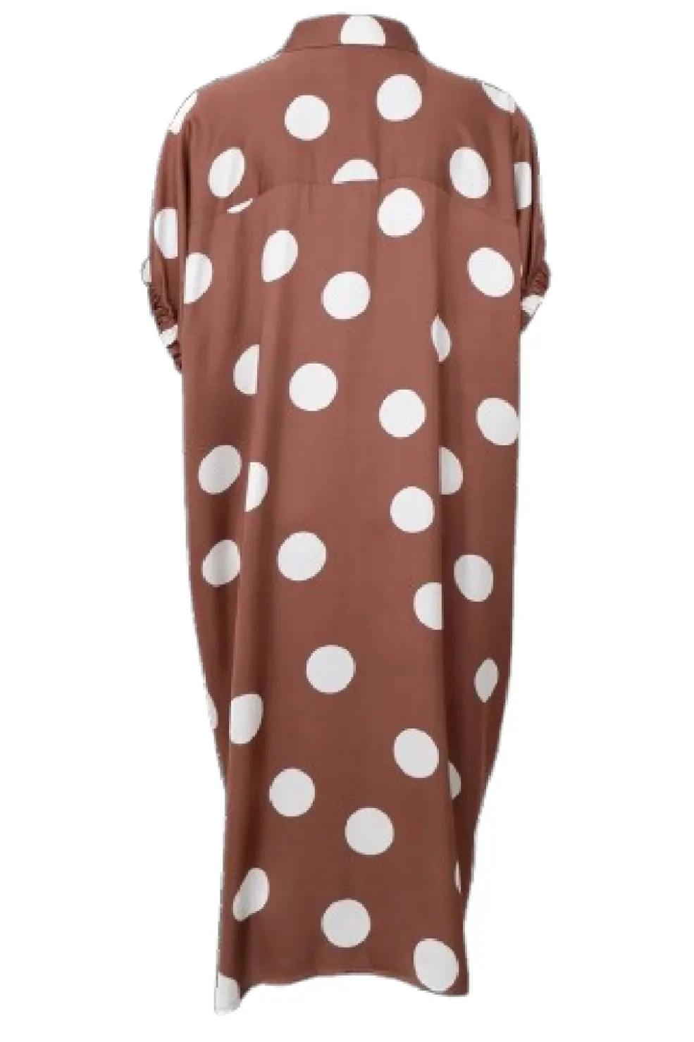 Brun kjole fra Black Colour med store hvide prikker. Den har en oversized pasform og går til knæet. Knapperne foran og skjortekraven giver kjolen et praktisk design.
