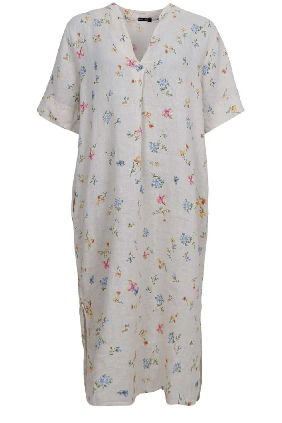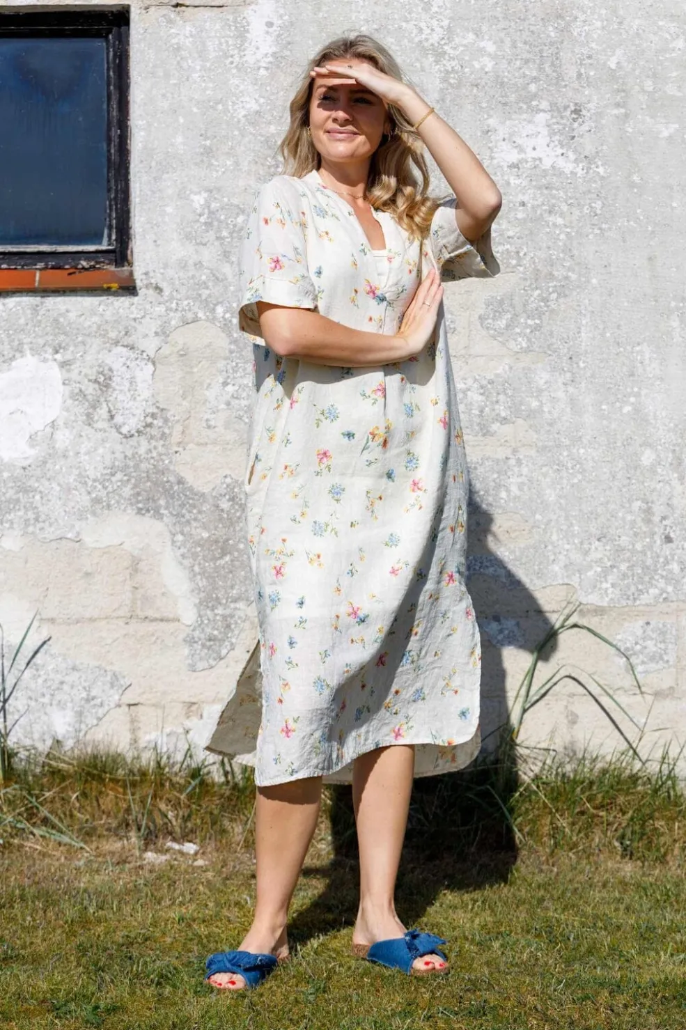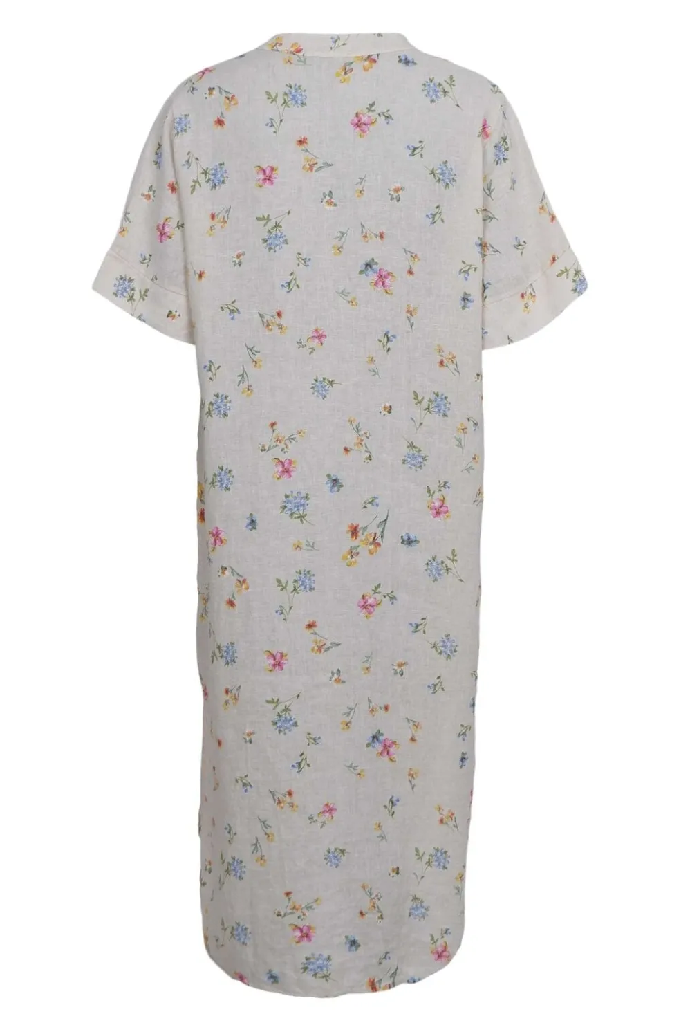 Lang hørkjole fra Black Colour med blomsterprint. Den hvide kjole har en løs pasform og korte ærmer. V-udskæringen og det lette stof giver en luftig fornemmelse.
