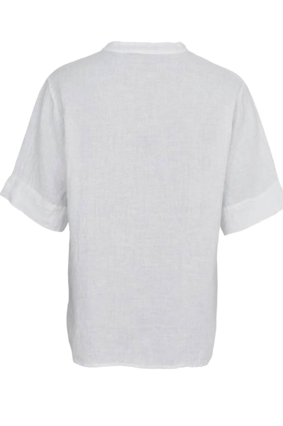 Hvid hørbluse fra Black Colour med løs pasform. Blusen har korte ærmer med opslåede manchetter og en V-udskæring, der giver et rent og enkelt udtryk.