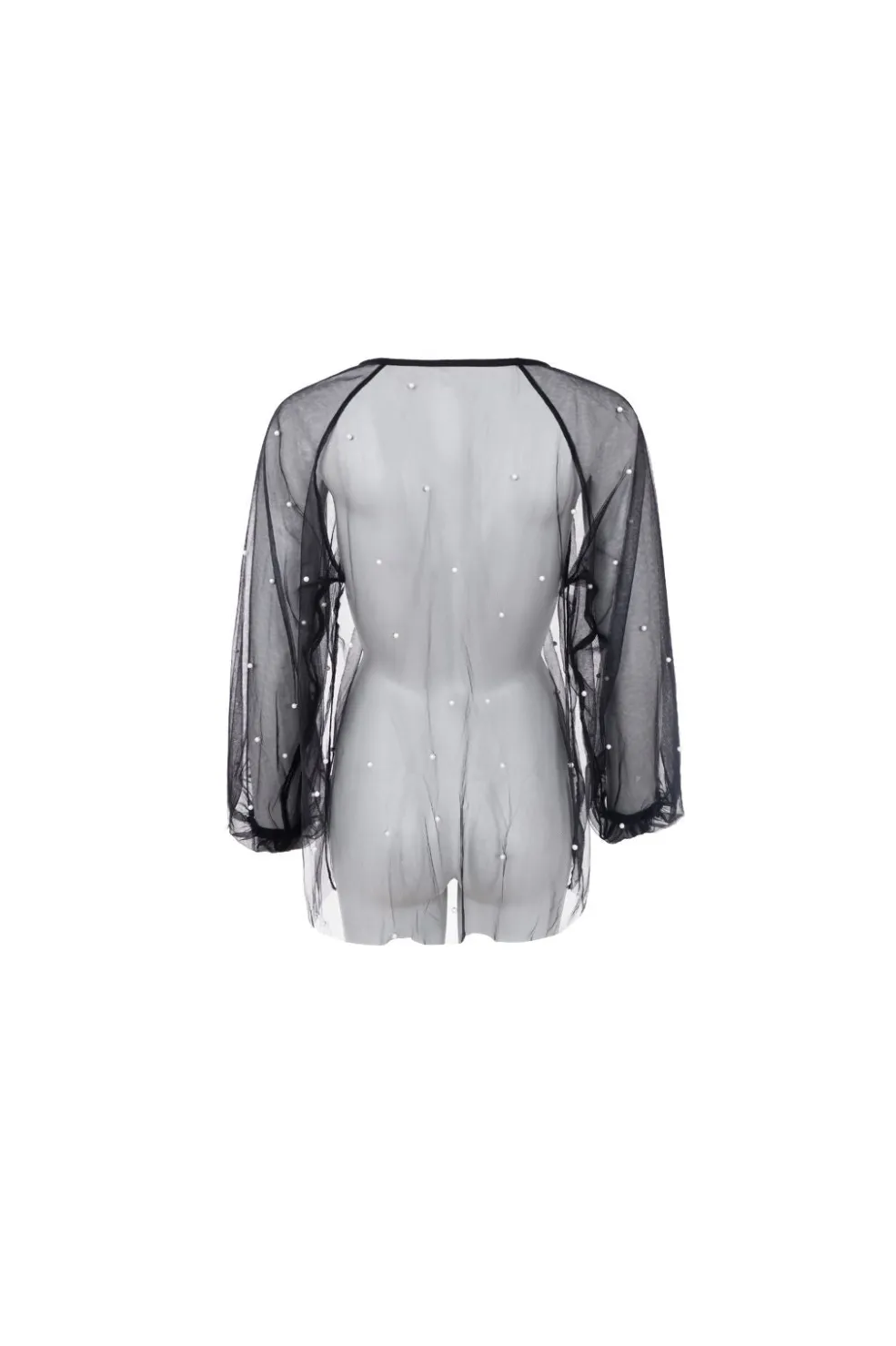 Sort gennemsigtig bluse fra Black Colour med polka dot-mønster. Blusen har perlelignende dekorationer og en løs pasform med lange ærmer og rund hals.