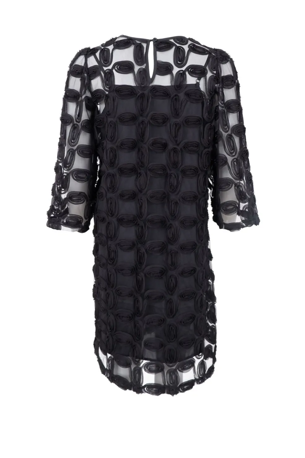 Sort kjole fra Black Colour med et særligt gittermønster. Kjolen har trekvartærmer og en rund halsudskæring med en lille nøglehulsåbning i nakken. Designet kombinerer broderi og blonder.