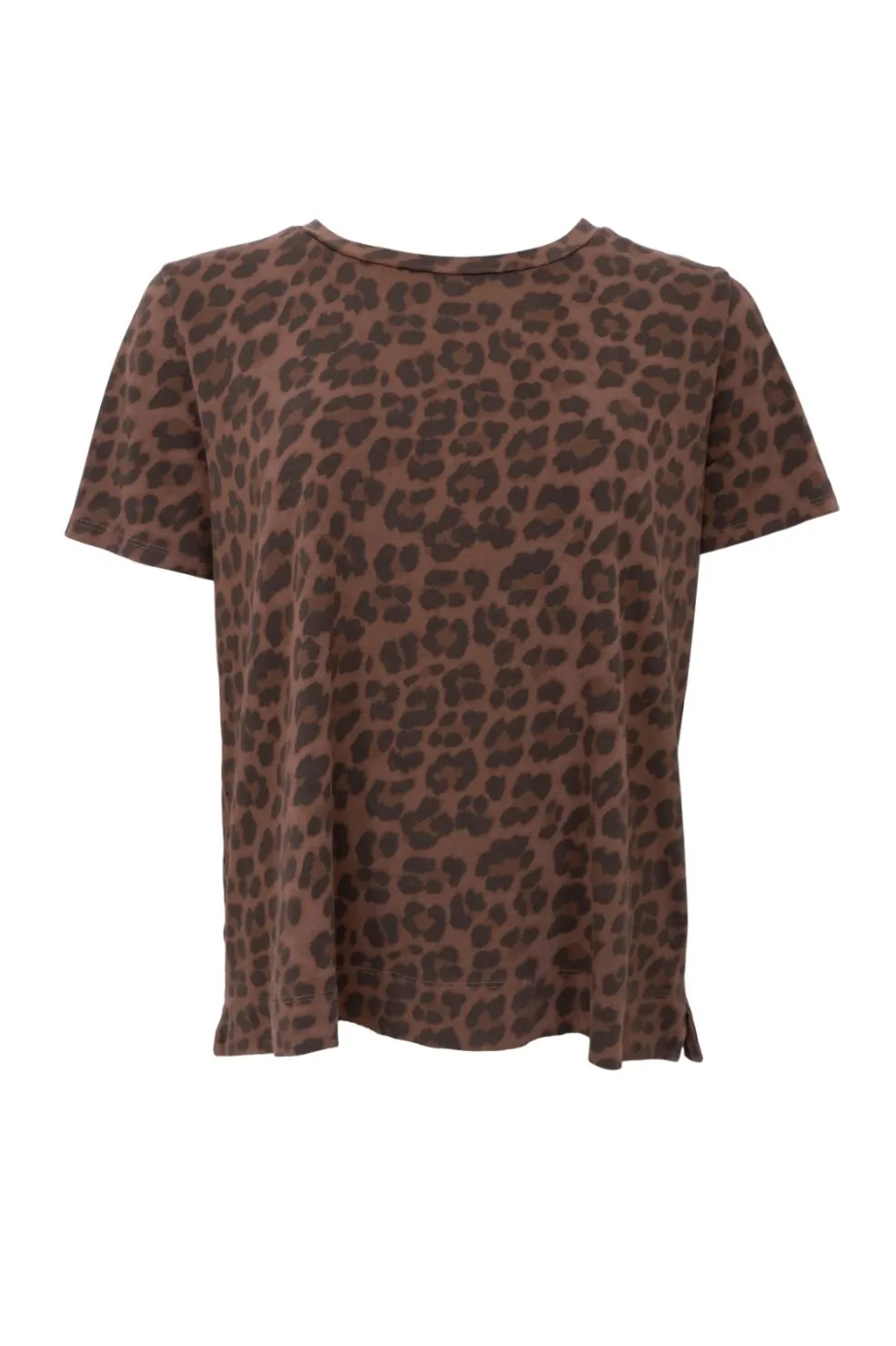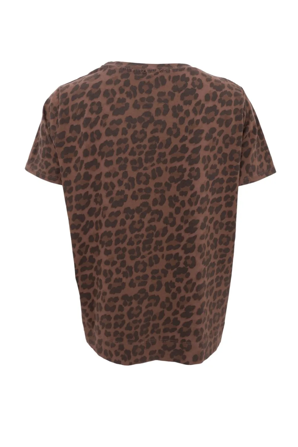 T-shirt fra Black Colour med leopardprint i brune og sorte nuancer. Den har en rund halsudskæring og korte ærmer, hvilket gør den praktisk til både hverdag og hjemmebrug.