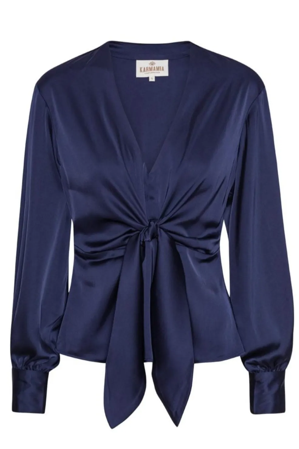 Mørkeblå bluse fra Karmamia med dyb V-hals og knudedetalje foran. Blusen har lange ærmer med manchetter og et blankt stof med et flot fald.
