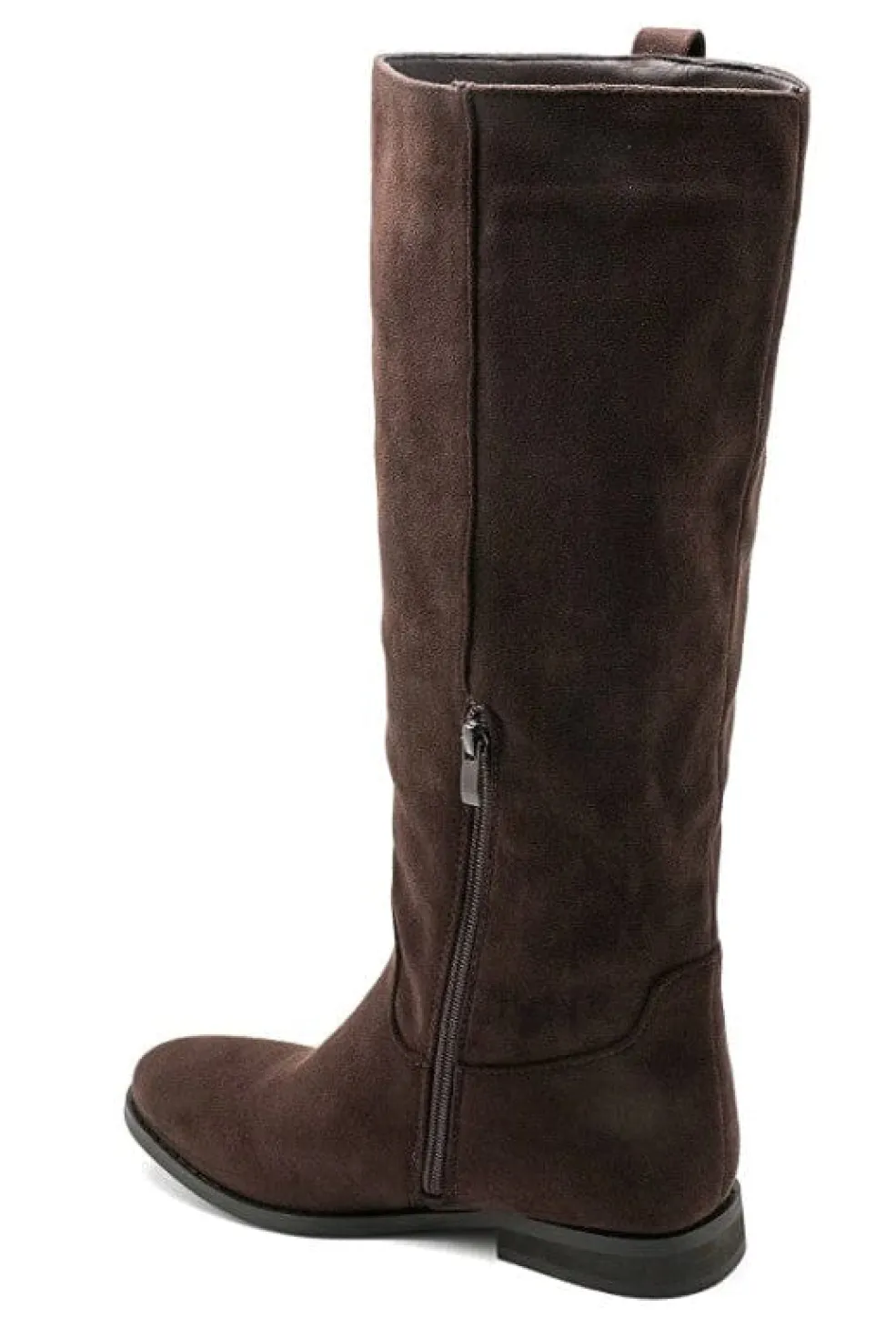 Høj støvle fra Bloom i en mørk rødbrun farve. Støvlen når lige under knæet og har et enkelt design i syntetisk materiale.