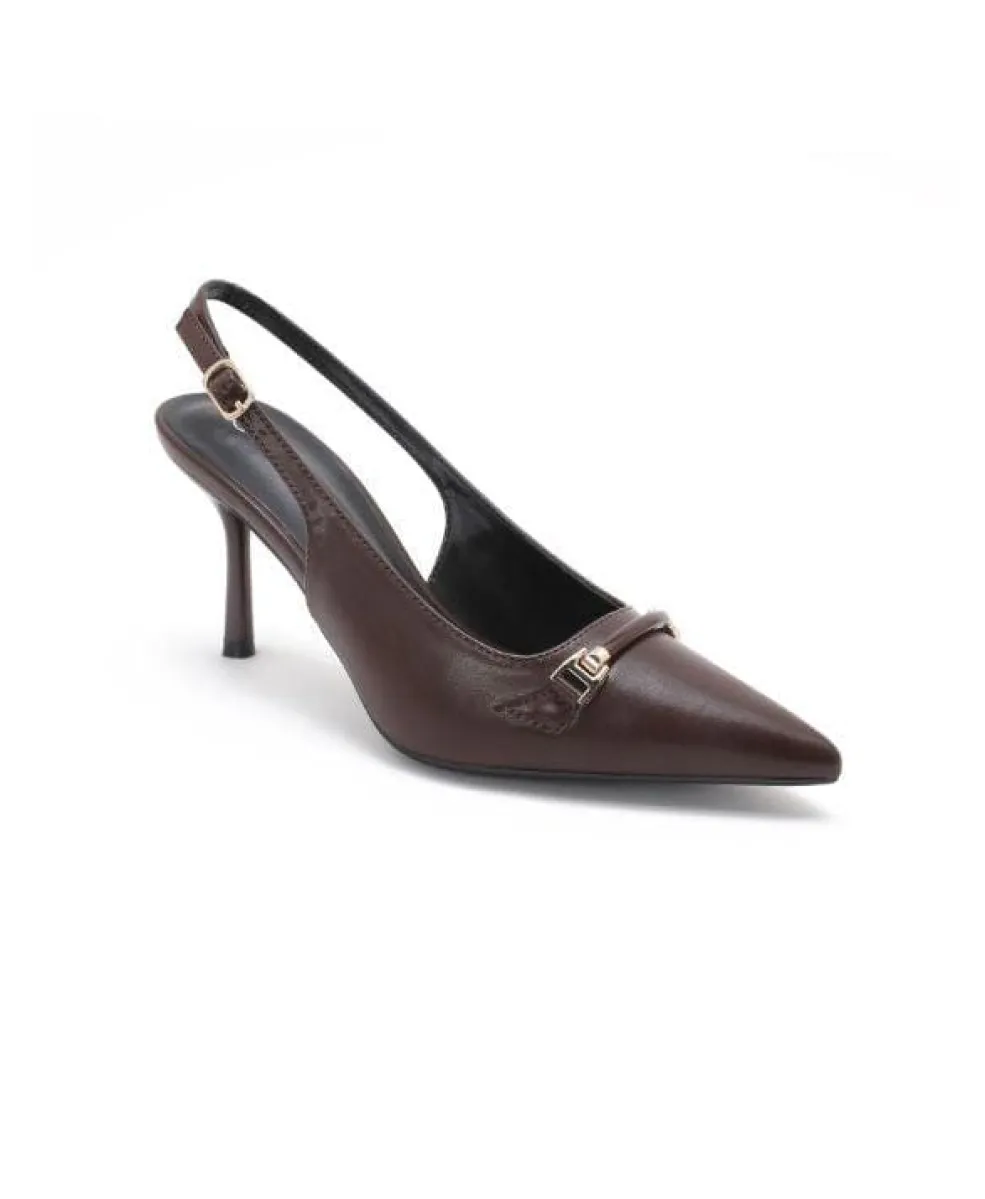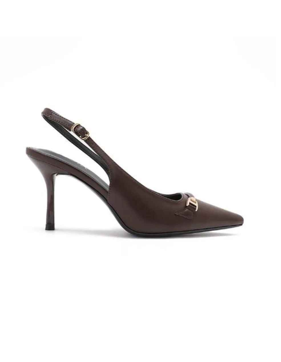 Stiletter fra Bloom i mørk maroon. Skoen har en spids tå, en slank stilethæl og en justerbar ankelrem med spænde.