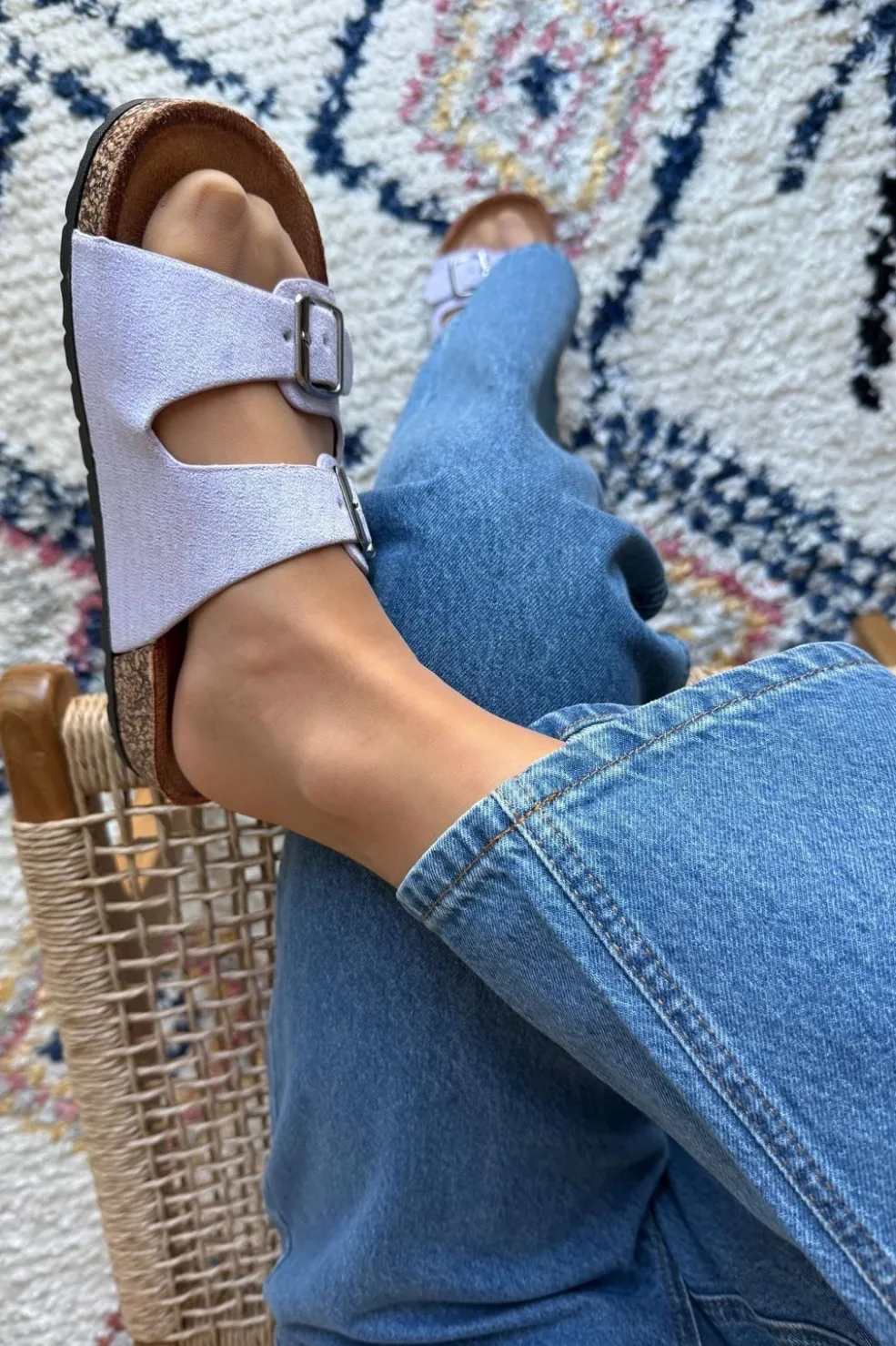 Lilla sandal fra Bloom med spændelukning og åben tå. Sandalen har en lav hæl og passer til både hverdag og fest.
