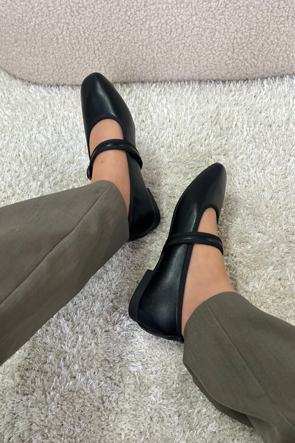 Sort ballerina fra Bloom med mandelformet tå og elastisk rem over vristen. En flad sko med god støtte til både hverdag og fest.