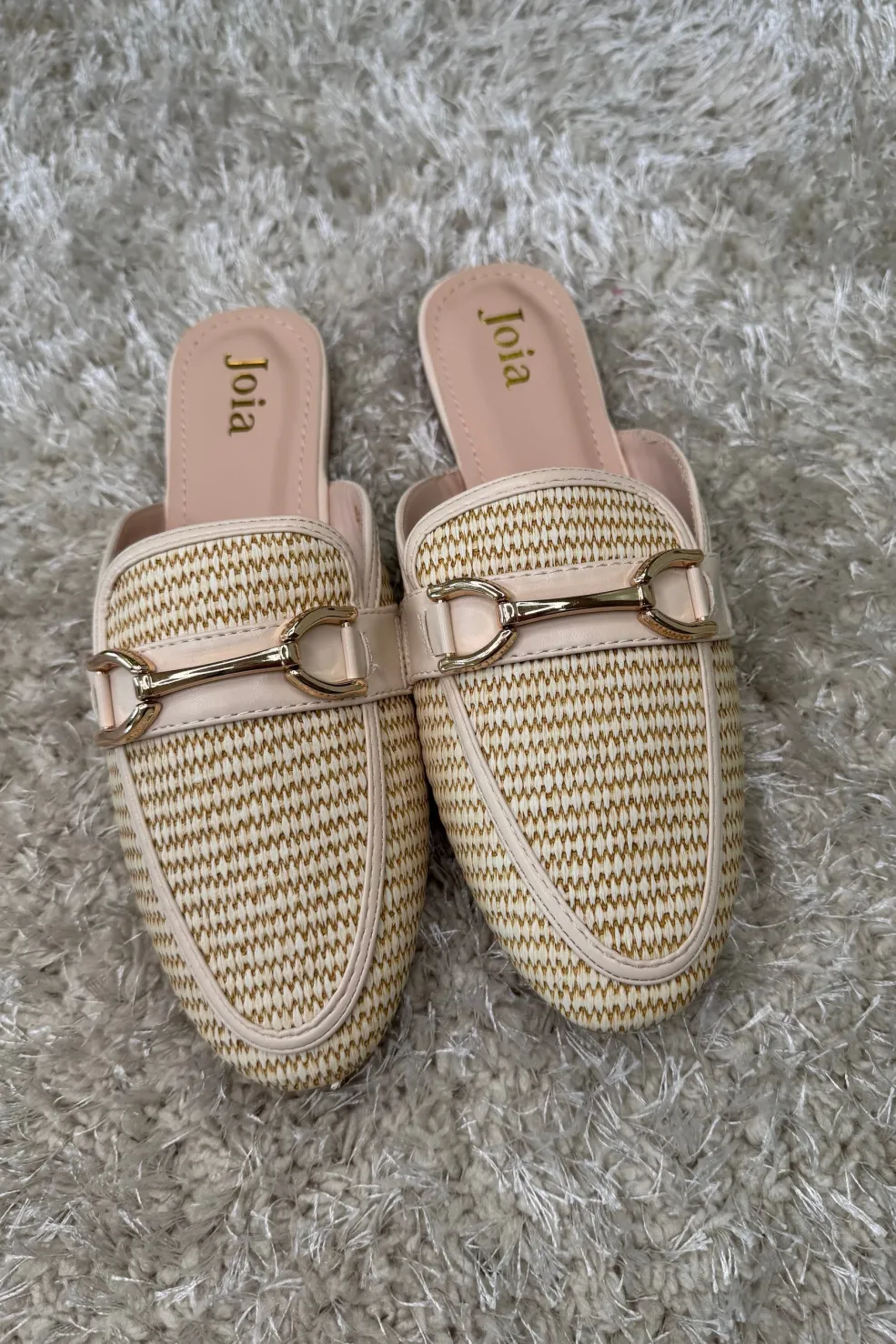 Beige mules fra Bloom med lav hæl og guldfarvet metalspænde. Skoene er lavet i et syntetisk materiale med et flettet mønster på overdelen.