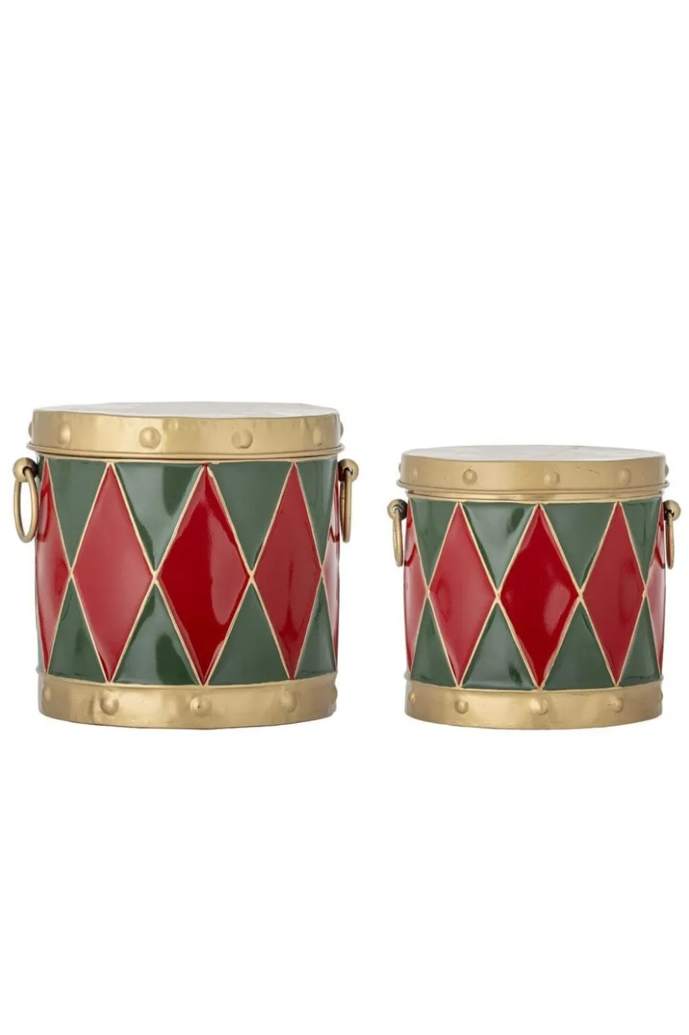 Trommeformet metalæske fra Bloomingville med rødt og grønt diamantmønster samt gulddetaljer. Sættet består af to æsker med aftagelige låg.