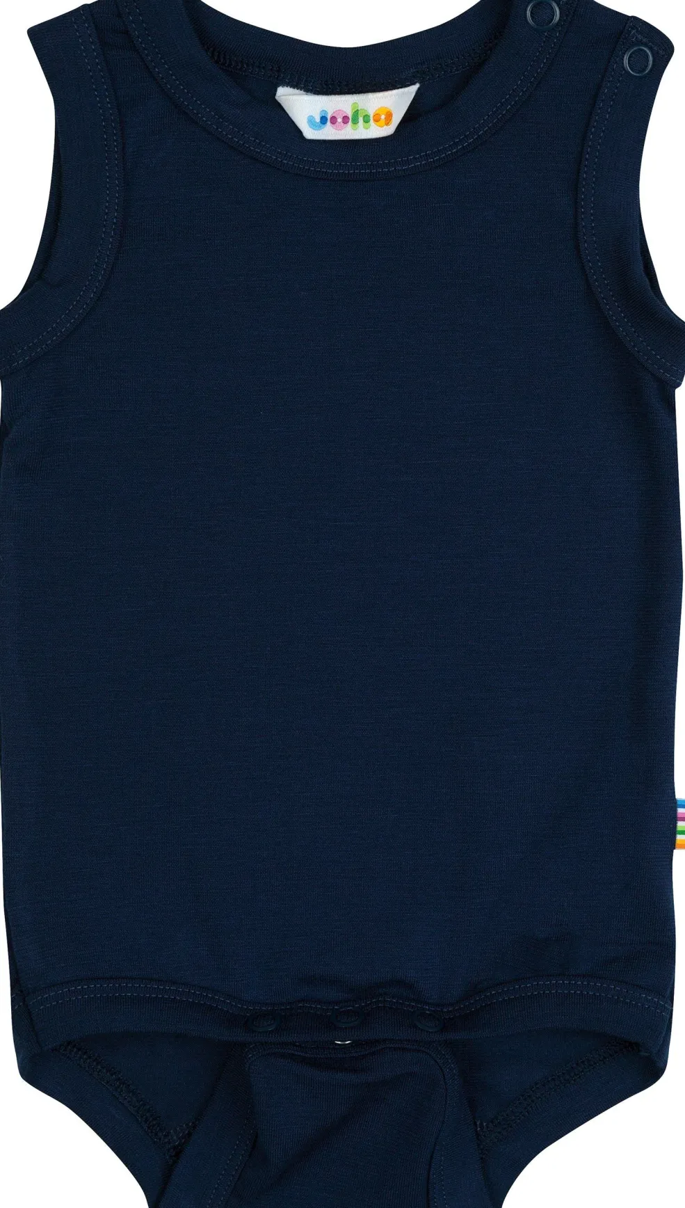 Mørkeblå ærmeløs bodystocking fra Joha. Fremstillet af blød bambus med stretch, der giver god bevægelsesfrihed. Den runde hals og trykknapper gør den praktisk at bruge.