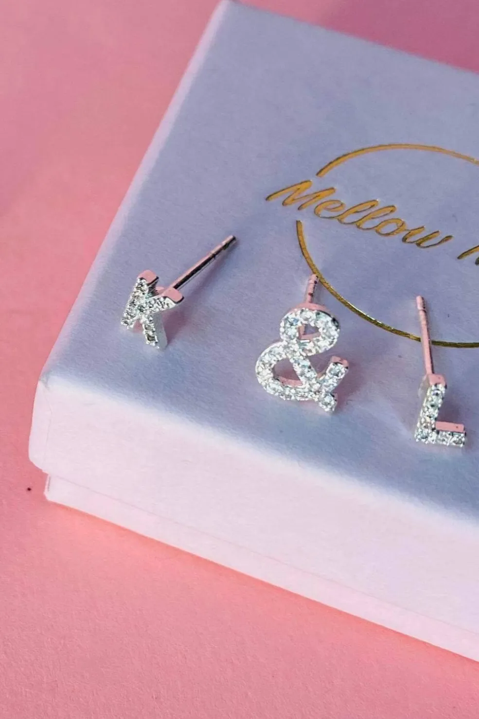 Bogstavørering fra Mellow Moon med små sten, der danner et bogstav. Øreringen er lavet i forsølvet messing og har små sten indsat i bogstavets form.