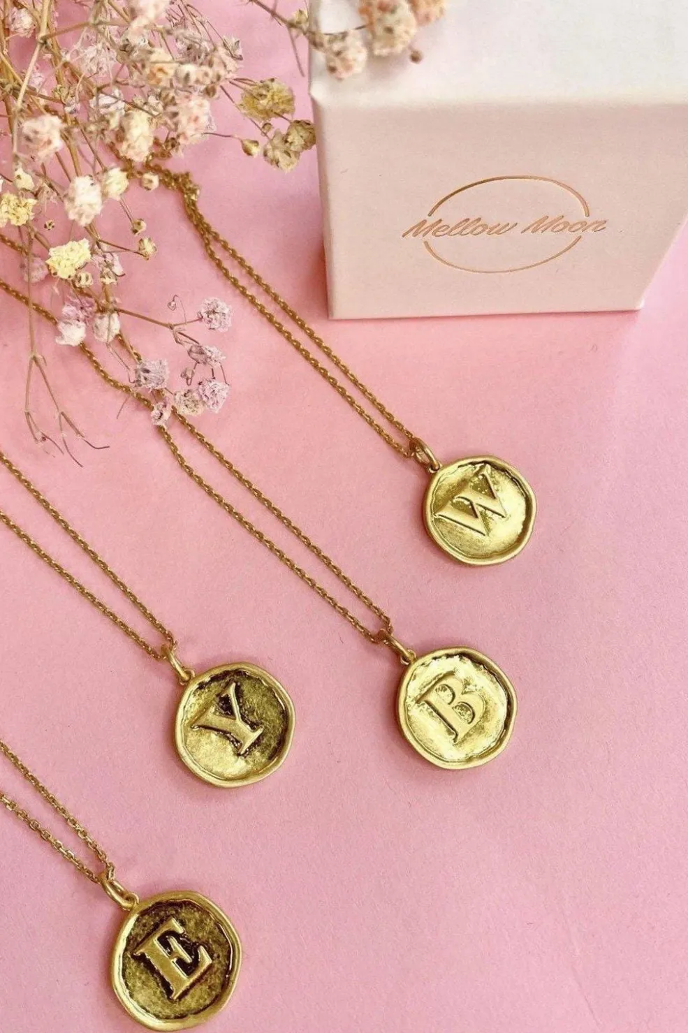 Bogstavkæde fra Mellow Moon med et rundt vedhæng til personligt bogstav. Kæden er lavet af messing med 18 karat forgyldning og har et enkelt, rent design.
