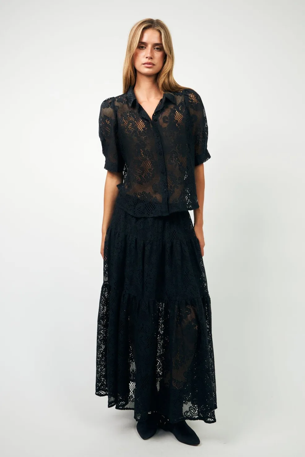 Mørkeblå skjorte fra Lollys Laundry med blomstret blondemønster. Skjorten har en klassisk krave, korte pufærmer og knapper hele vejen ned foran.