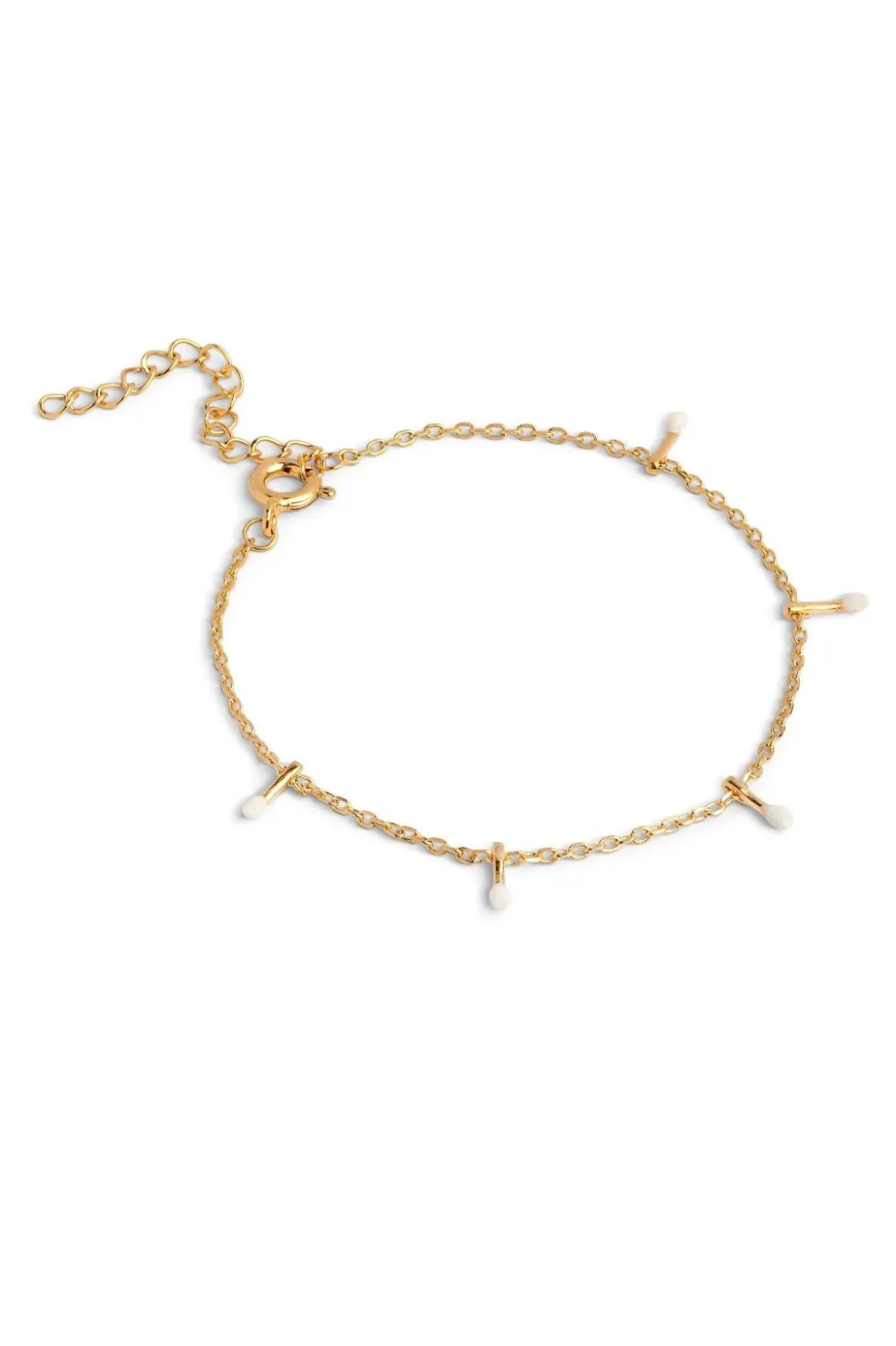 Armbånd fra Enamel Copenhagen, fremstillet af 18K guldbelagt genanvendt sterling sølv. Den guldfarvede kæde har små håndmalede emaljedetaljer i form af hvide dråber.