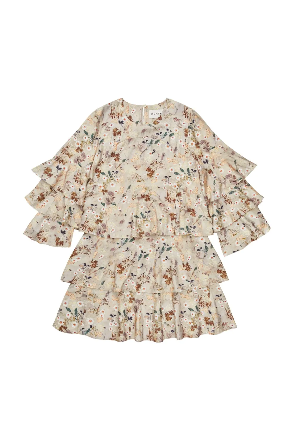 En kjole fra Munthe med et blomstret mønster i flere farver. Kjolen har flæser og volanter, der giver struktur til både ærmerne og skørtet.