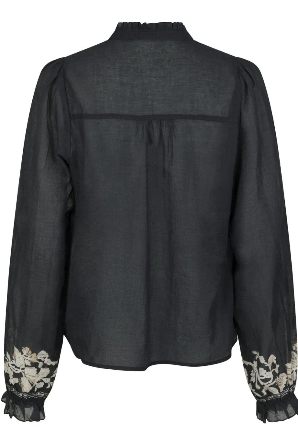 Bluse fra Neo Noir i mørkeblå voile med beige og cremefarvede blomster. Den har V-hals, knapper foran og flæsedetaljer, der giver blusen et blødt udtryk.