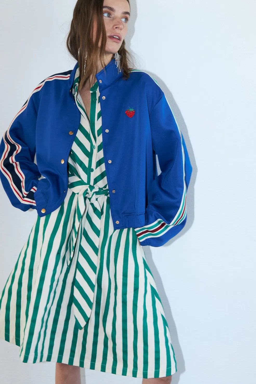 Kort blå jakke fra Lollys Laundry, lavet af polyester og elastan. Jakken har en høj hals og lange ærmer med farvede striber.