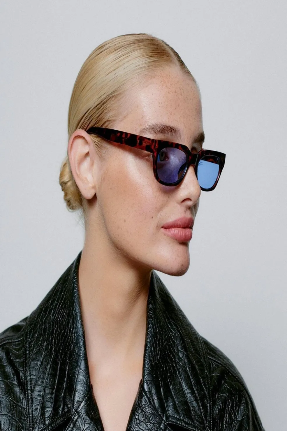 Rektangulære solbriller fra A. Kjærbede med brun tortoise-mønstret stel og blå linser. Solbrillerne har formbare stænger med metalkerner og 5-tønders optiske hængsler i høj kvalitet.