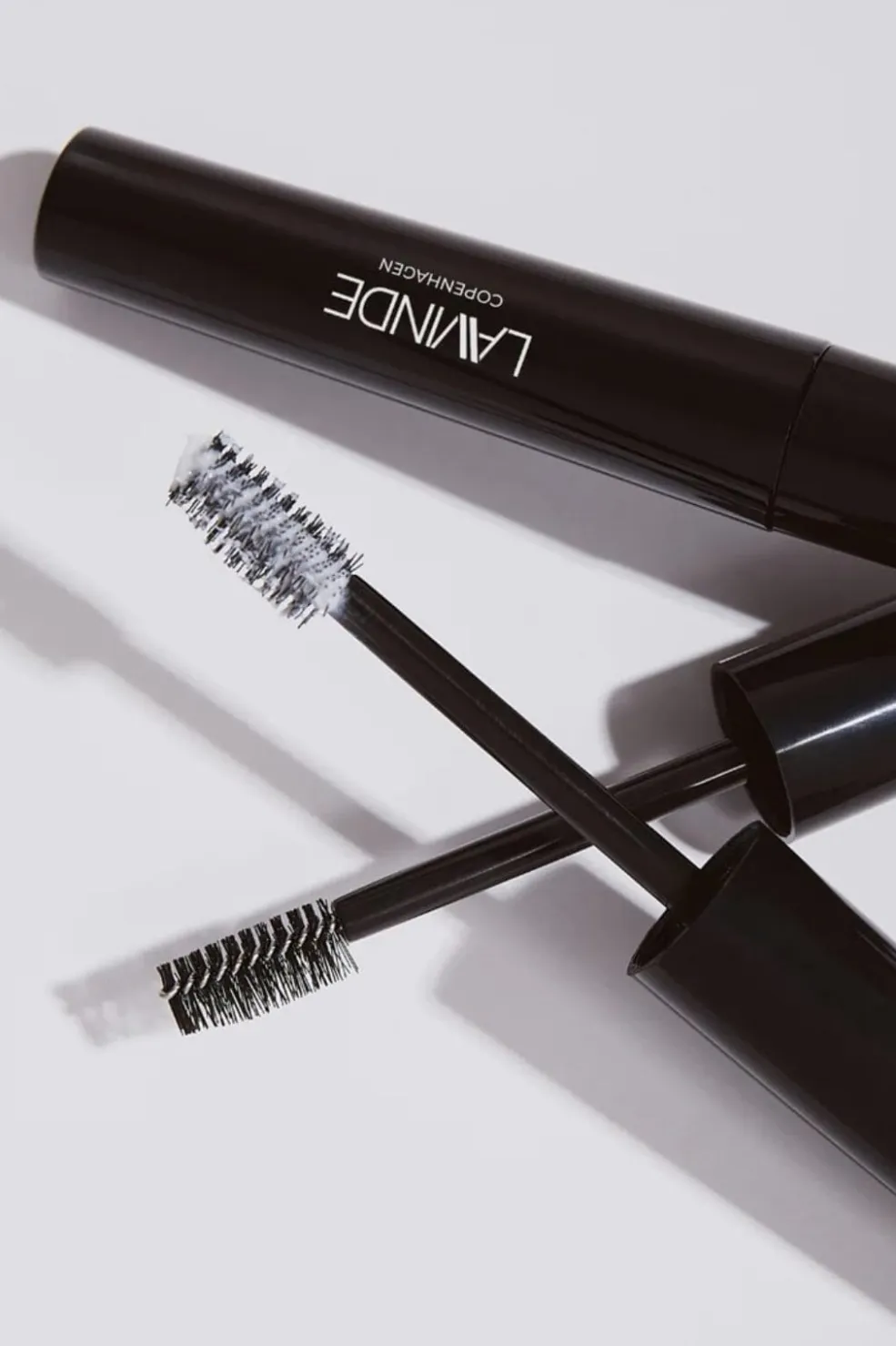 Transparent bryngel fra Lavinde Copenhagen i sort tube med dobbeltsidet børste. Produktet kombinerer styling og pleje i ét ved hjælp af aktive ingredienser som niacinamid og biotinoyl tripeptid-1.